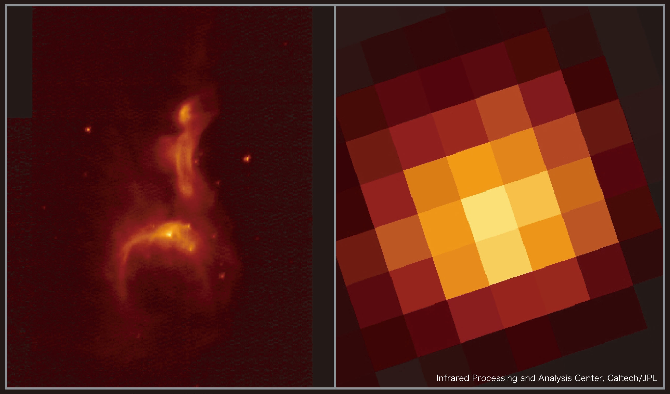 Images of the reflection nebula IC4954 taken by the near- and mid-InfraRed Camera (IRC) on-board AKARI (left) and the IRAS satellite (right). The great improvement in resolution and sensitivity by the AKARI instruments is clearly seen.