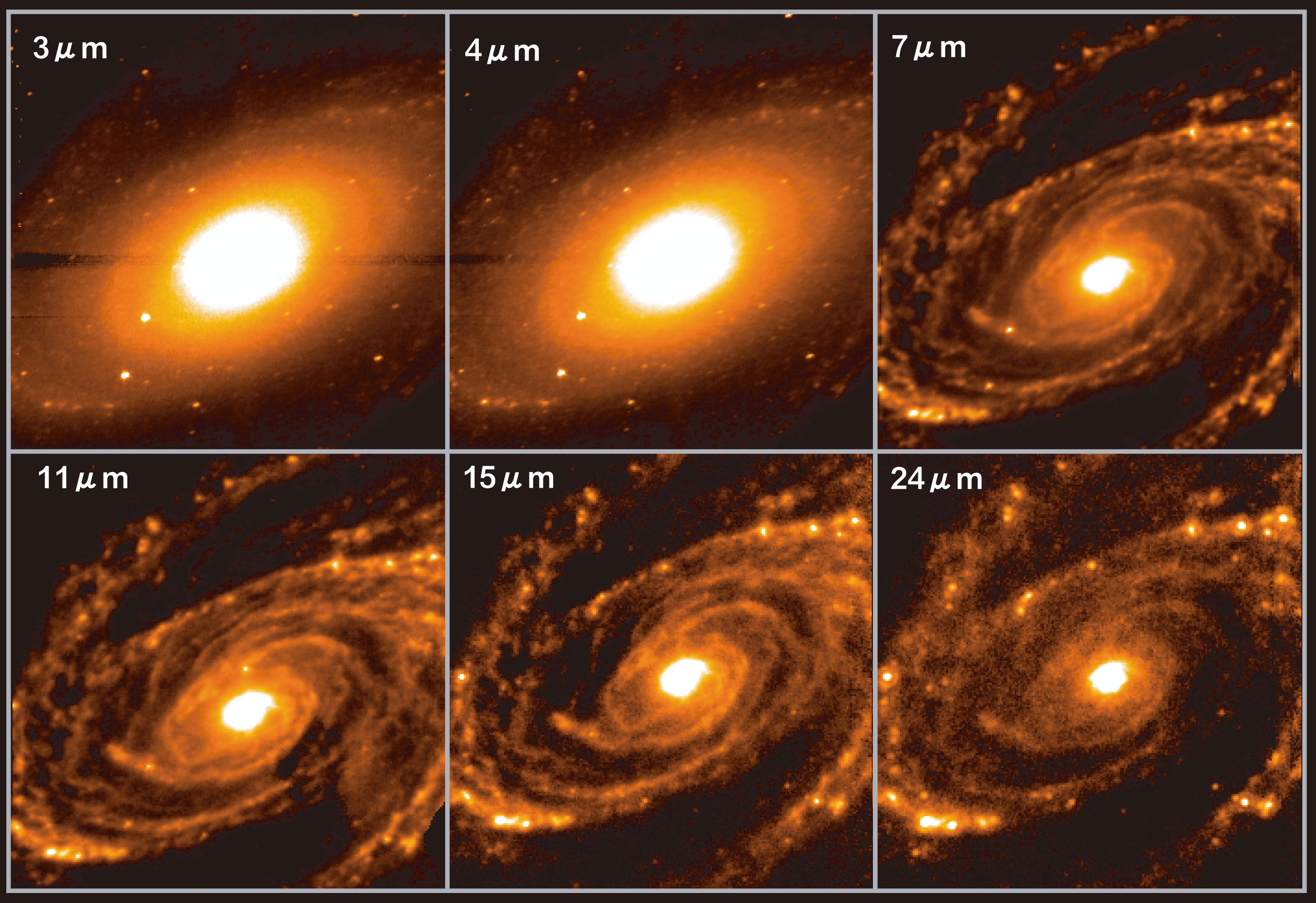 The images at 3 and 4 μm show the distribution of stars in the inner part of the galaxy without any obscuration from intervening dust clouds. At 7 and 11 μm the radiation from organic materials in the interstellar gas of the galaxy can be seen. The distribution of the dust heated by young hot stars is exhibited in the images at 15 and 24 μm, showing that the star forming regions sit along the spiral arms of the galaxy.