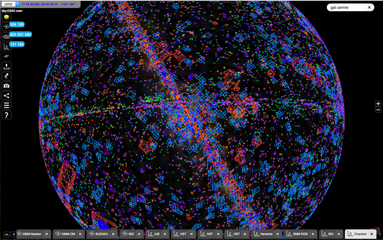 By zooming out to see half of the sky and displaying the footprints from all the missions (visualised as squared in different colours), the users get a coverage map of all observations ever done from the X-ray to the far-infrared in one single map.