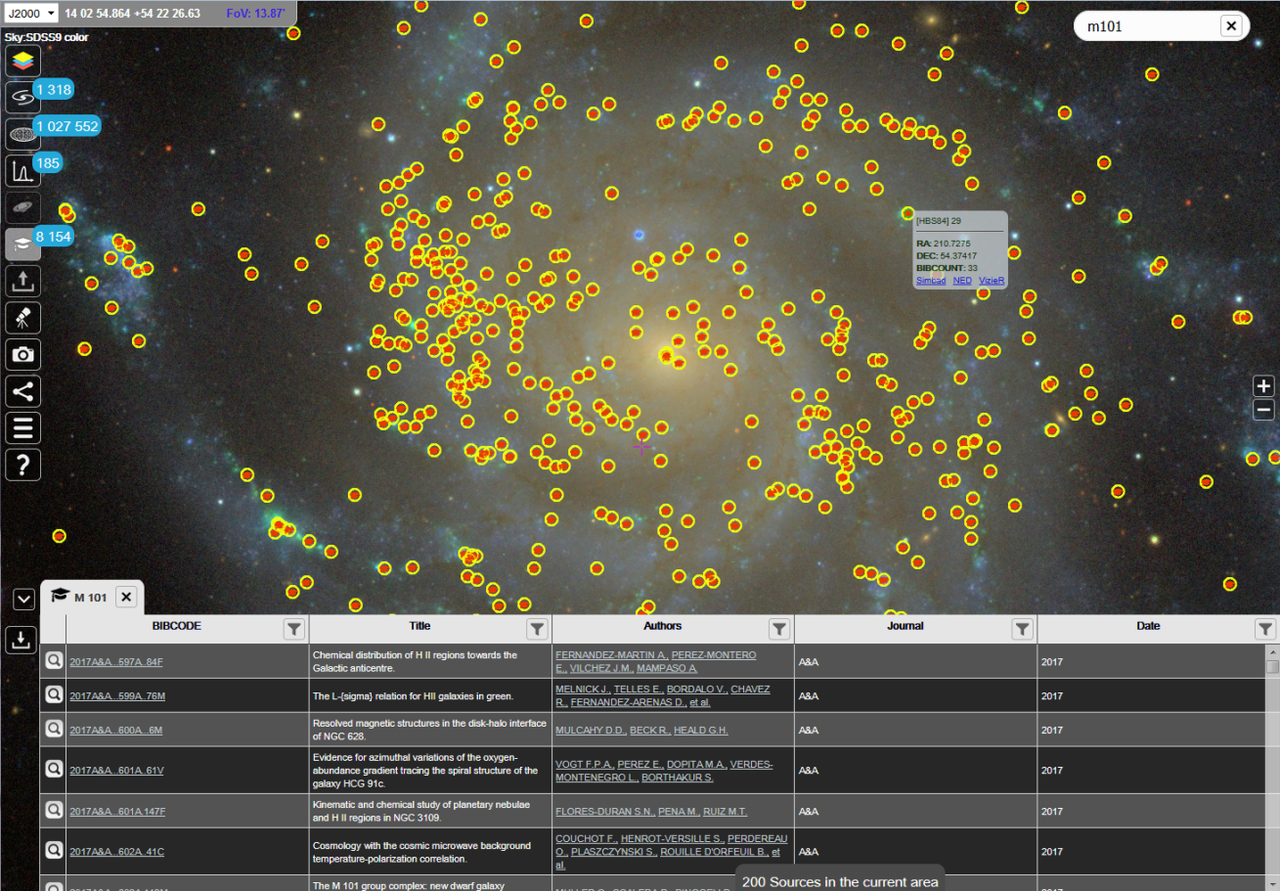 The yellow and red circles are clickable icons that refer to scientific publications related to individual sources in this galaxy, bringing up the publication details in the lower panel. These include direct links to the publications in the NASA Astrophysics Data System.