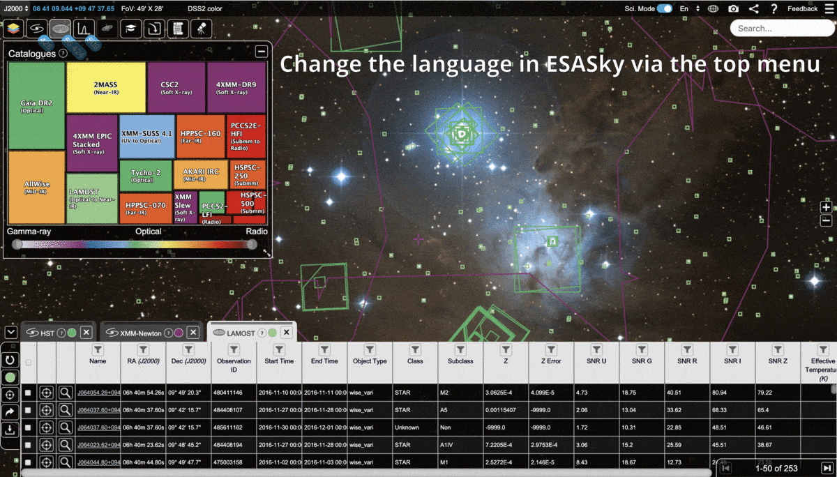 ESA's world-leading interactive celestial atlas, ESASky, is now available in Mandarin. Changing the language is controlled by a simple drop-down menu. Together with its English and Spanish language versions, ESASky is now available to nearly one quarter of the world in their native tongue.
