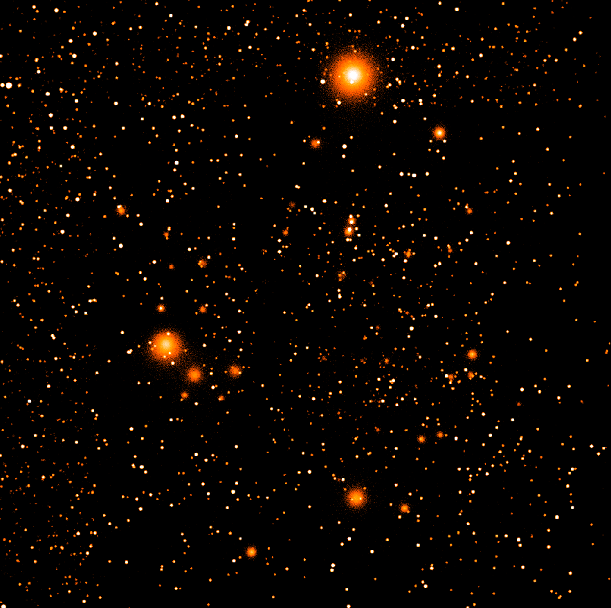 This image was created in June of 2019 using the SIXTE (SImulation of X-ray TElescopes) software package and simulates how Athena's WFI instrument will view the Chandra Deep Field South over a period of 500 000 seconds, equivalent to over 138 hours. It spans 40 arcminutes on each side. Simulated clusters of galaxies have been added to the field to demonstrate Athena's capabilities to discriminate point-like sources like active galaxies from diffuse sources, such as the X-ray emission coming from the hot gas that pervades galaxy clusters.