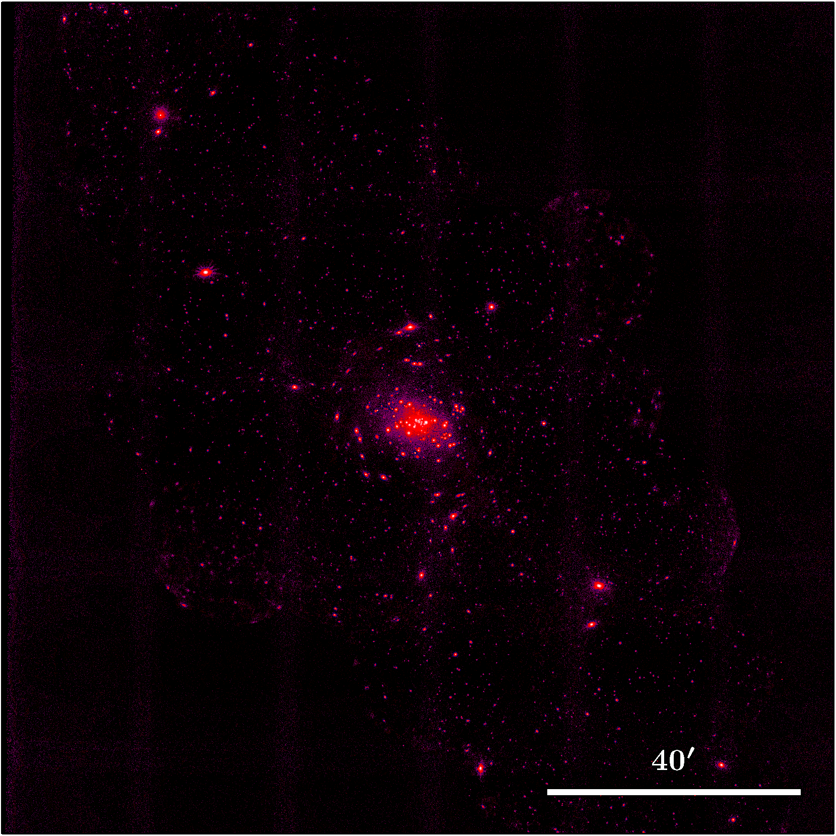 Athena is equipped with two incredibly precise instruments, the Wide Field Imager (WFI) and the X-ray Integral Field Unit (X-IFU). This image, spanning about two degrees on each side, is a mosaic of ten simulated observations with Athena's WFI instrument, each lasting 10 000 seconds (just over two and a half hours). This imager's sensitivity and surveying speed will top even the most powerful X-ray observatories active today, allowing Athena to generate the most accurate catalogue of X-ray sources ever created.