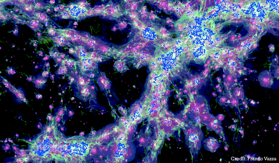 This image is part of a large cosmological simulation, and shows the simulated emission of X-rays (pink) and radio waves (green) for a portion of the cosmic web. The additional blue contours mark areas in which a future detection of low-density gas should be possible using both Athena and radio telescopes such as the upcoming Square Kilometer Array (SKA). The simulation took nearly two million CPU hours at the Swiss National Supercomputing Centre.