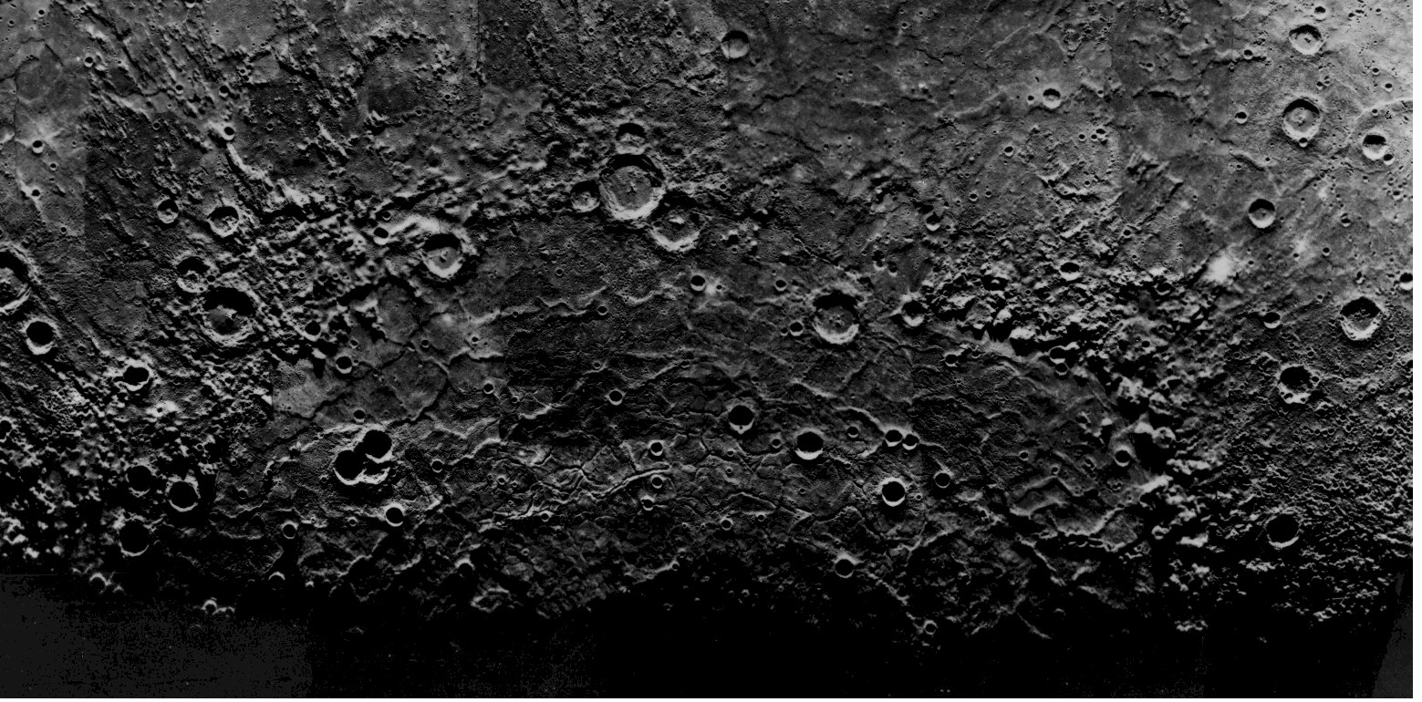 Mosaic of images obtained by Mariner 10 of the largest impact basin on Mercury, the multi-ringed Caloris Basin with a diameter of 1300 km. Only the half of the basin that was illuminated at the time is seen in this view.