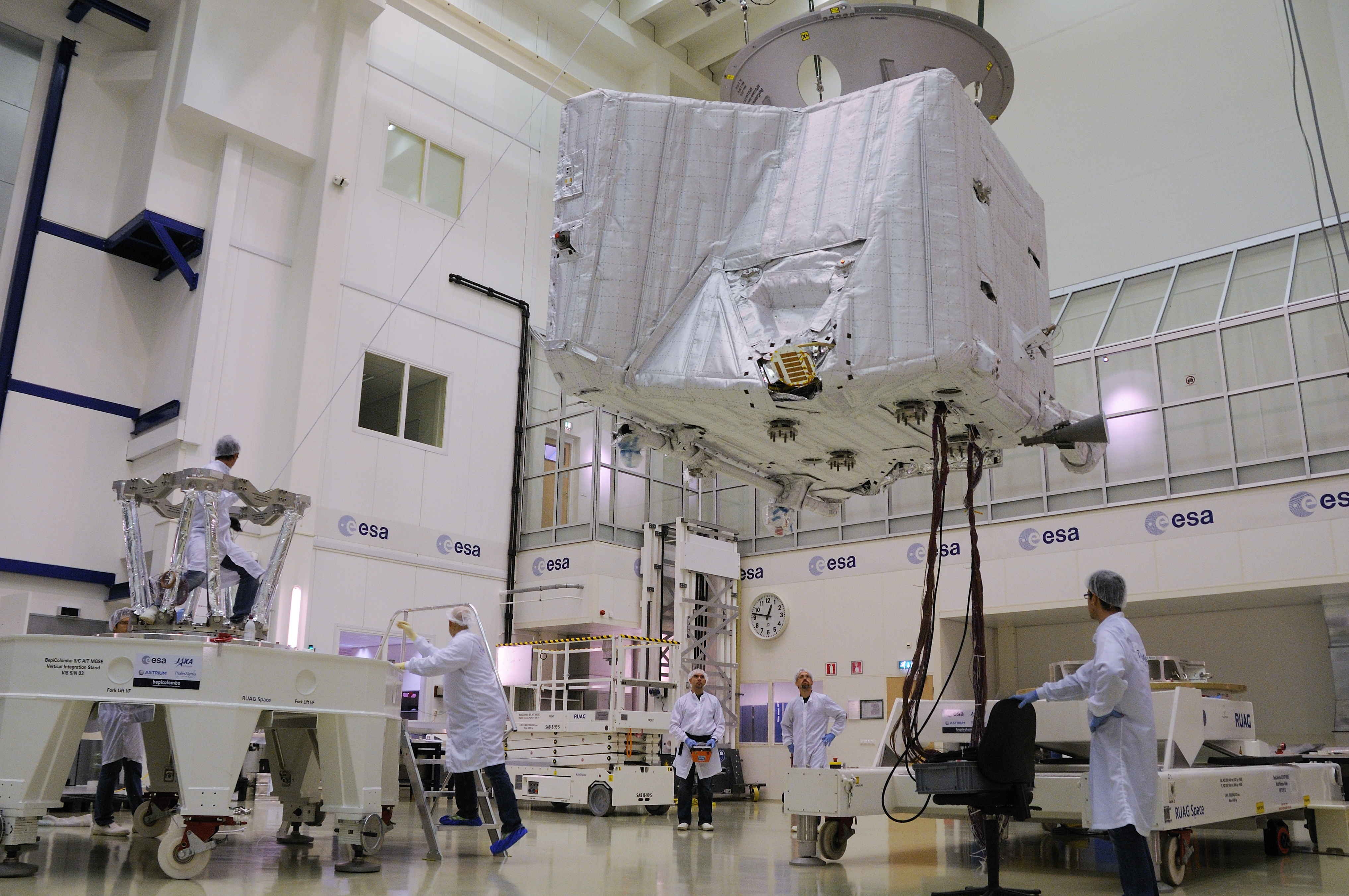 An overhead crane lifts the BepiColombo Mercury Planetary Orbiter (MPO) Structural and Thermal Model from its ground handling trolley onto its Thermal Test Adapter (TTA).