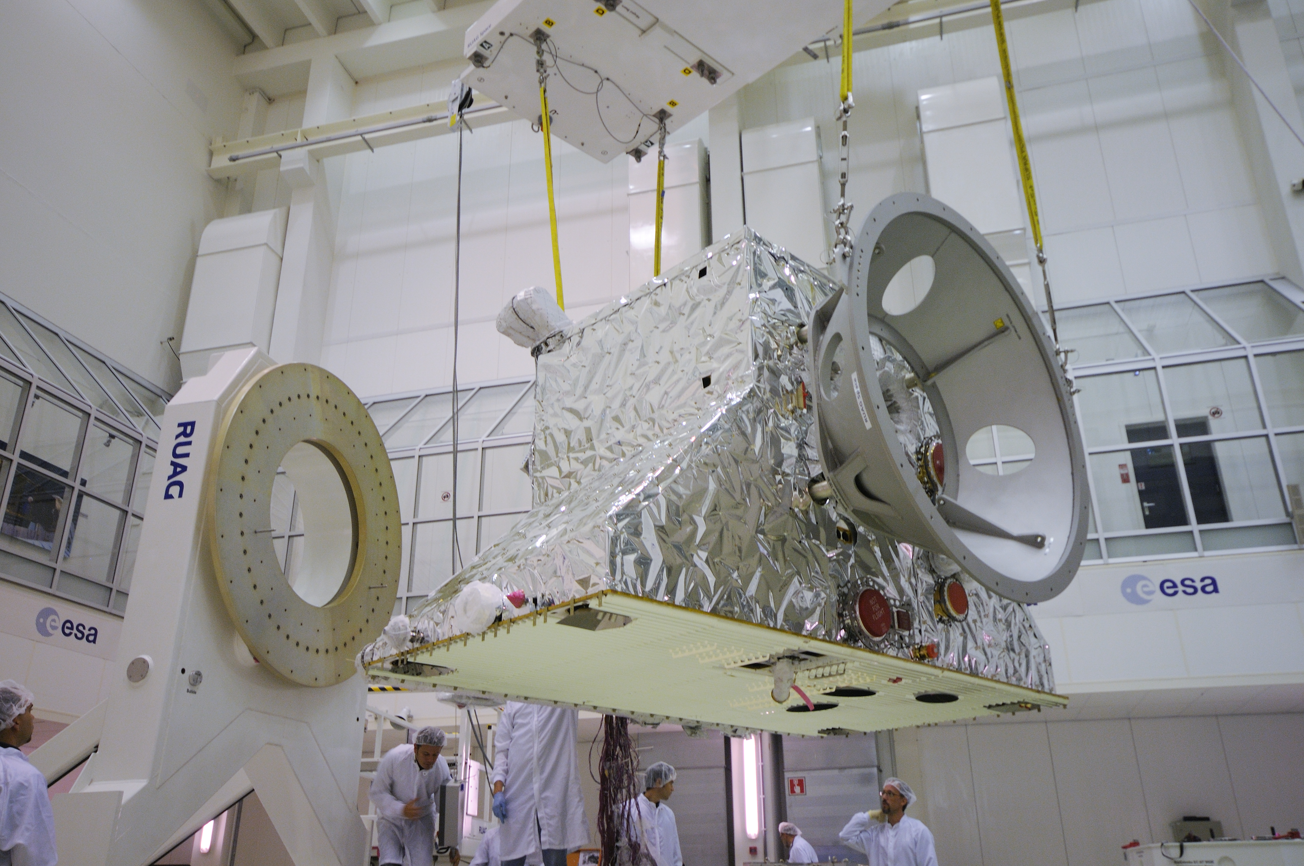 The overhead crane and special lifting adapter (top of image) turning the BepiColombo Mercury Planetary Orbiter Structural and Thermal Model through 180° about its Y-axis. It is being mounted on the ground handing trolley via its -Z (top, in launch configuration) face, to enable technicians to access the +Z face for thermal hardware installation.