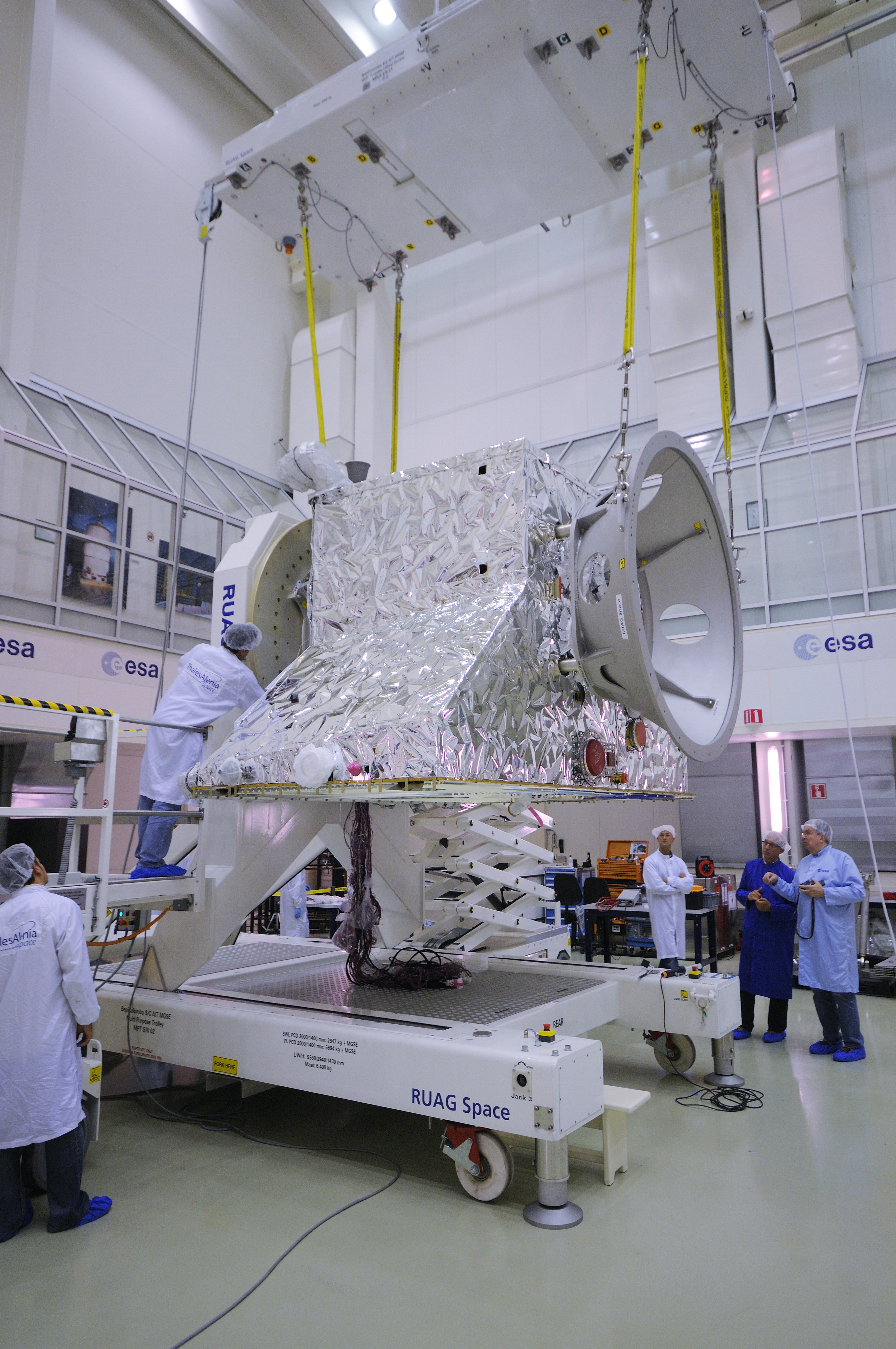 The overhead crane and special lifting adapter (top of image) bear the weight of the BepiColombo Mercury Planetary Orbiter Structural and Thermal Model as it is moved into position and bolted to the ground handling trolley.