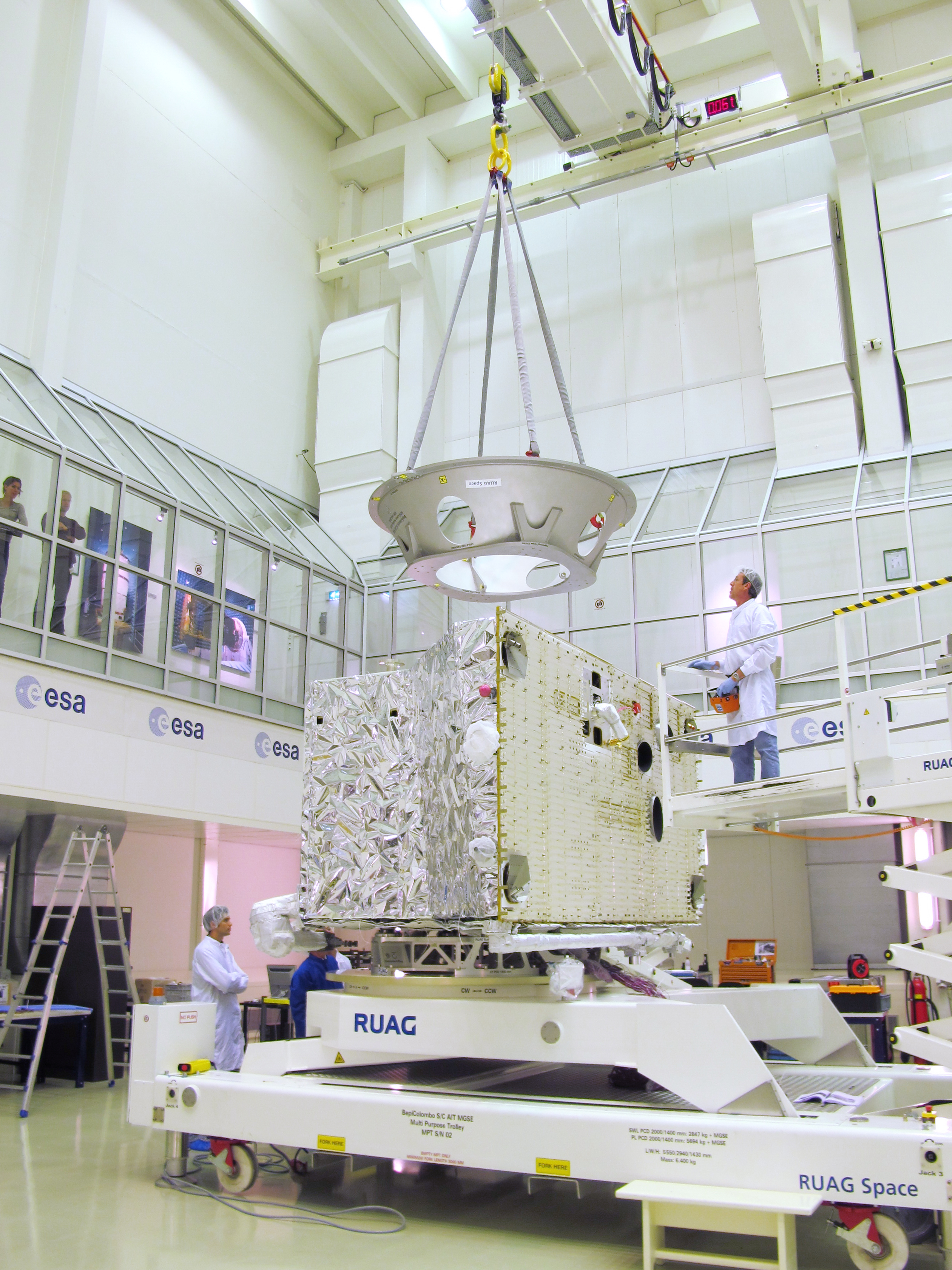 The mounting adapter being lifted off of the BepiColombo Mercury Planetary Orbiter Structural and Thermal Model so that technicians can access the +Z face for installation of thermal hardware.