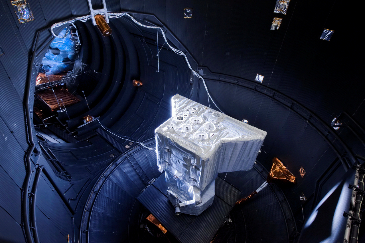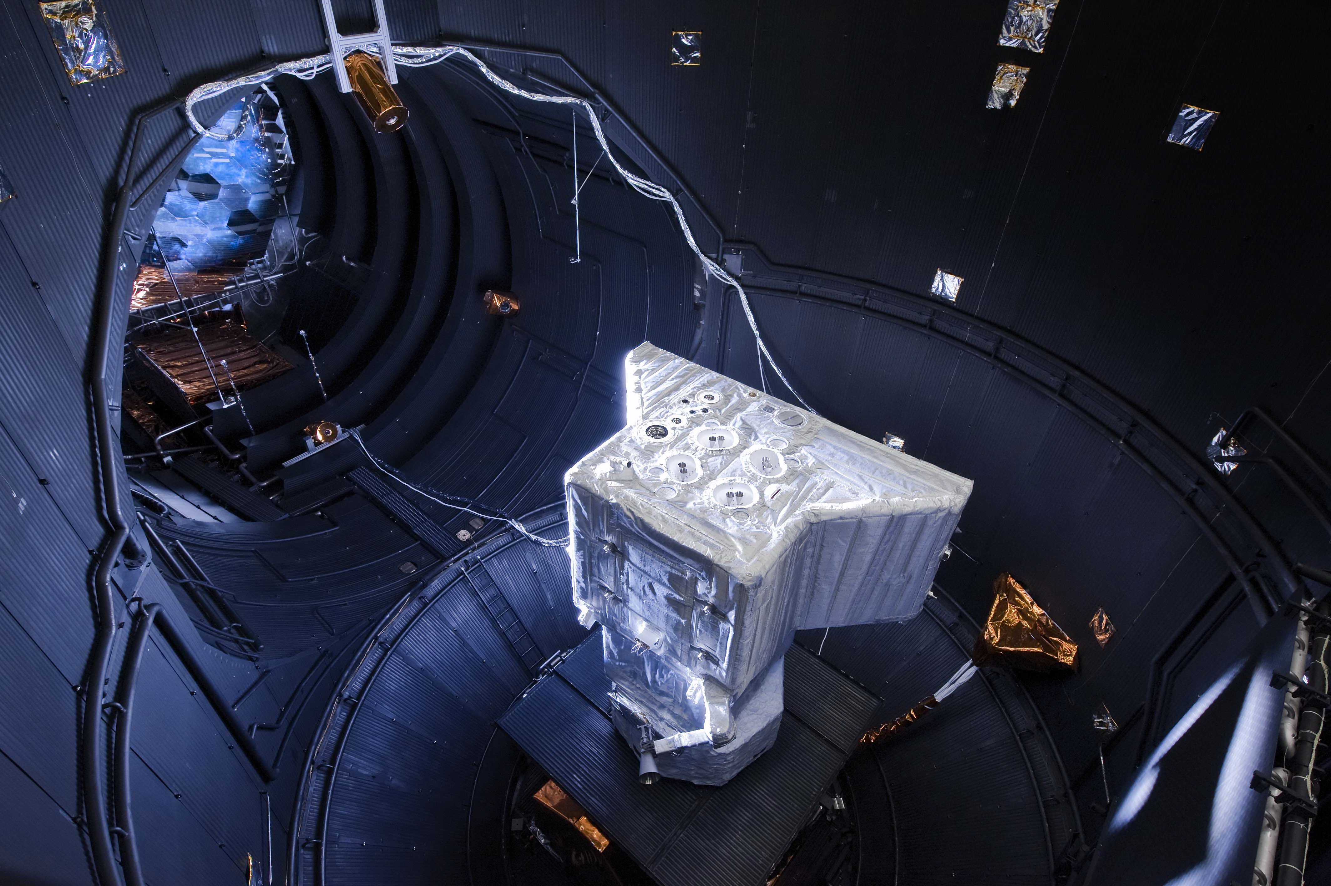 The Structural and Thermal Model (STM) of the BepiColombo Mercury Planetary Orbiter (MPO) in the Large Space Simulator (LSS) at ESA's Test Centre in Noordwijk, the Netherlands during a 'dry run' on 13 September to verify the performance of the spacecraft, its instrumentation, and the gimbal stand / spin box and levelling table that support, orient, rotate and level the spacecraft during testing. The dry run was performed in preparation for thermal-balance testing.