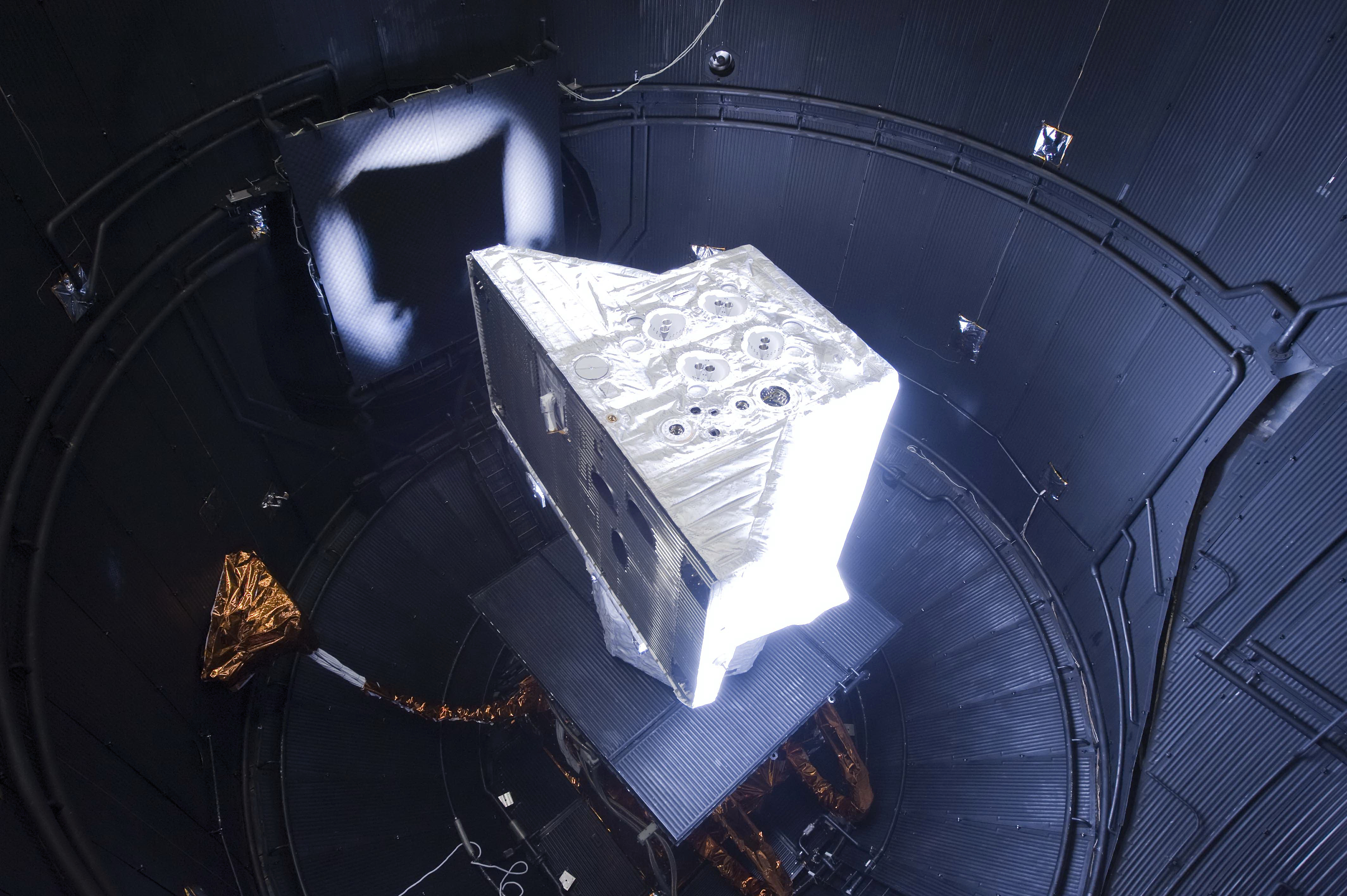 The Structural and Thermal Model (STM) of the BepiColombo Mercury Planetary Orbiter (MPO) in the Large Space Simulator (LSS) at ESA's Test Centre in Noordwijk, the Netherlands during a 'dry run' on 13 September in preparation for thermal balance testing.