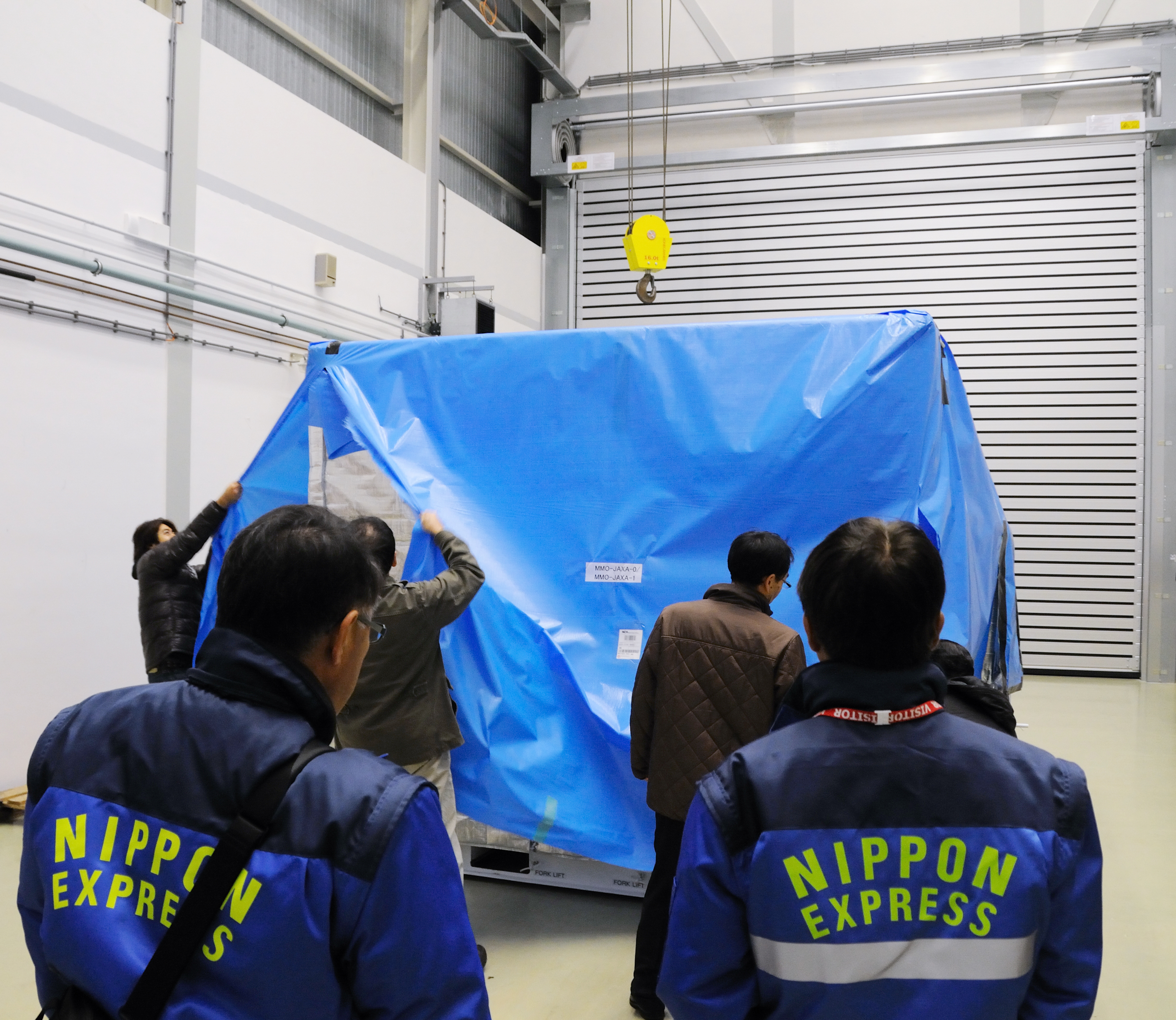 The BepiColombo Mercury Magnetospheric Orbiter (MMO) Structural Model arrives at ESA's European Space Research and Technology Centre in Noordwijk, the Netherlands, on 7 November 2011. The spacecraft, in its transport container, has been moved into the Test Centre loading bay and the container tarpaulin is about to be removed.