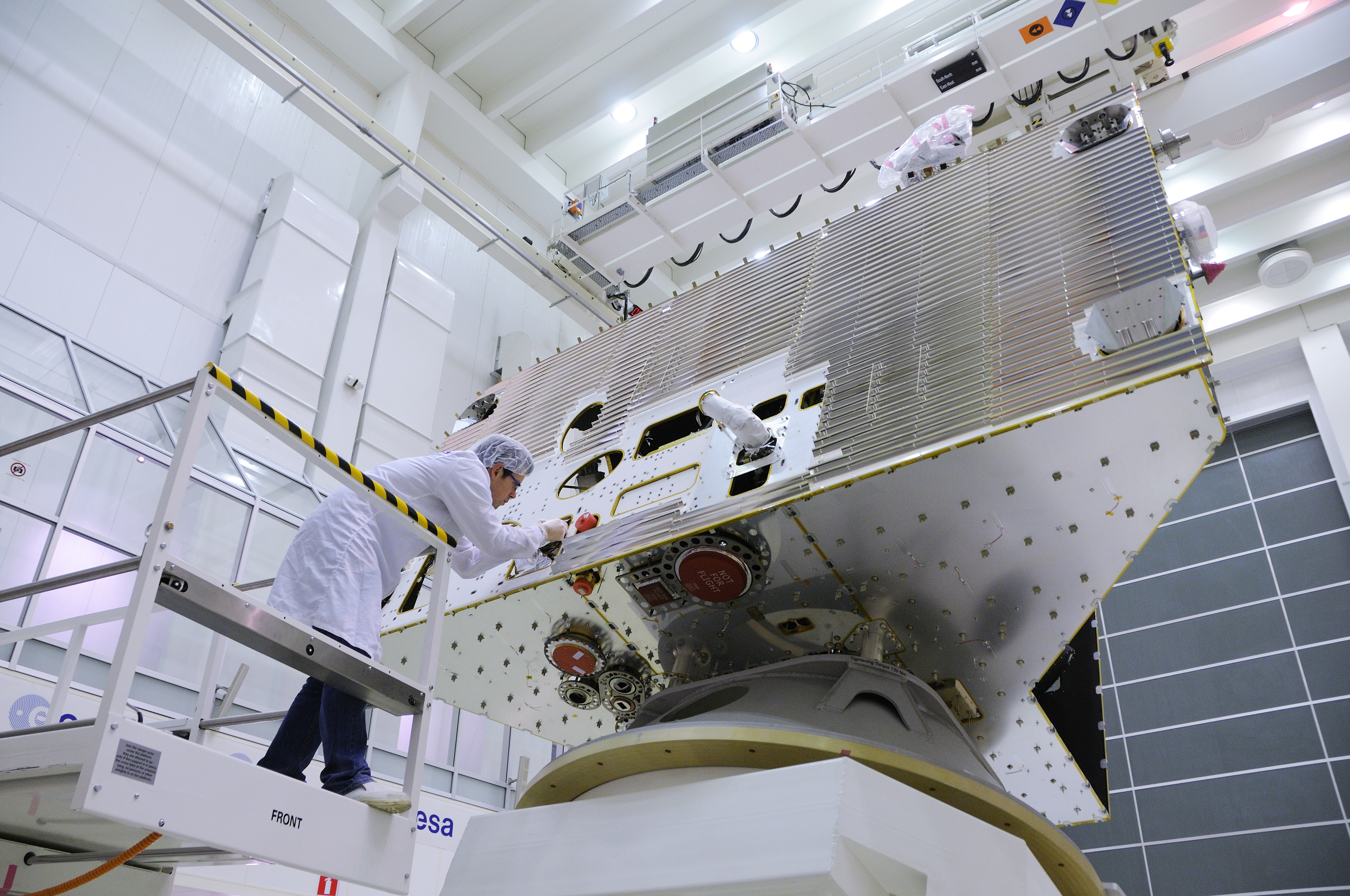 The BepiColombo Mercury Planetary Orbiter (MPO) Structural and Thermal Model - with its thermal blankets removed – on its ground handling trolley during an alignment check in the 'Rosetta' cleanroom at ESA's European Space Research and Technology Centre in Noordwijk, the Netherlands, on 8 November 2011.
