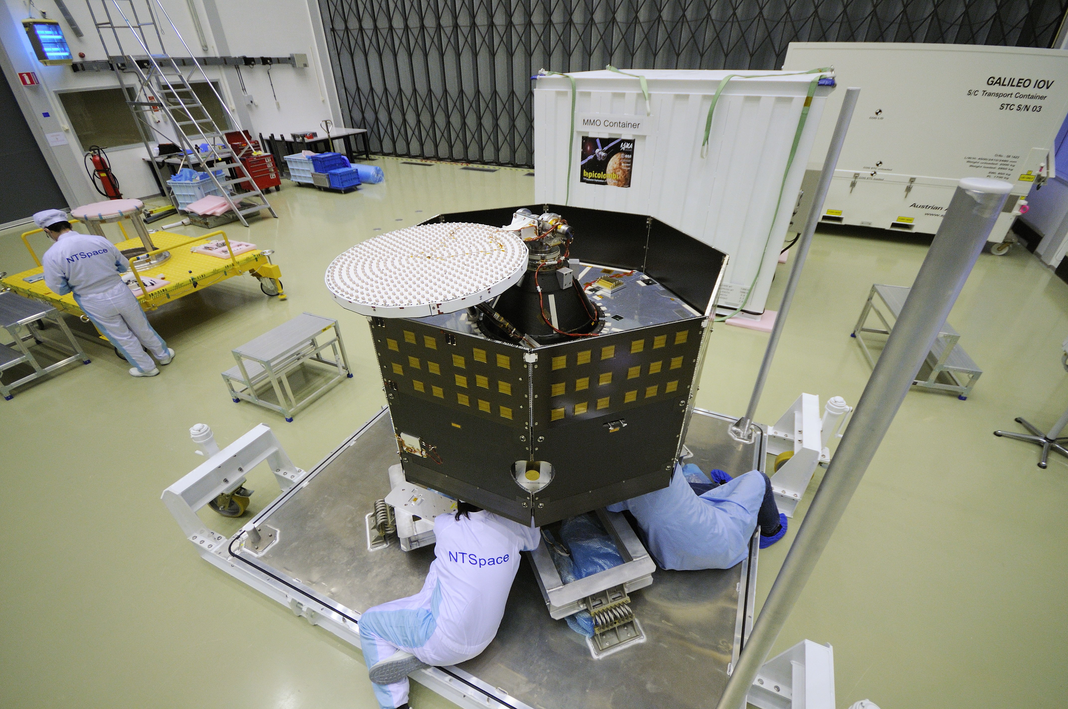 The circular white panel on top of the spacecraft is the MMO High Gain Antenna (HGA), which is in its stowed position and securely locked in the launch configuration; it will be deployed after launch The antenna is mounted on a pedestal (black cone on spacecraft top panel) housing a de-spin mechanism that will become active once the MMO is separated from the MPO in Mercury orbit. The MMO spacecraft will be spin stabilised, but the de-spin mechanism will keep the HGA pointing towards Earth.