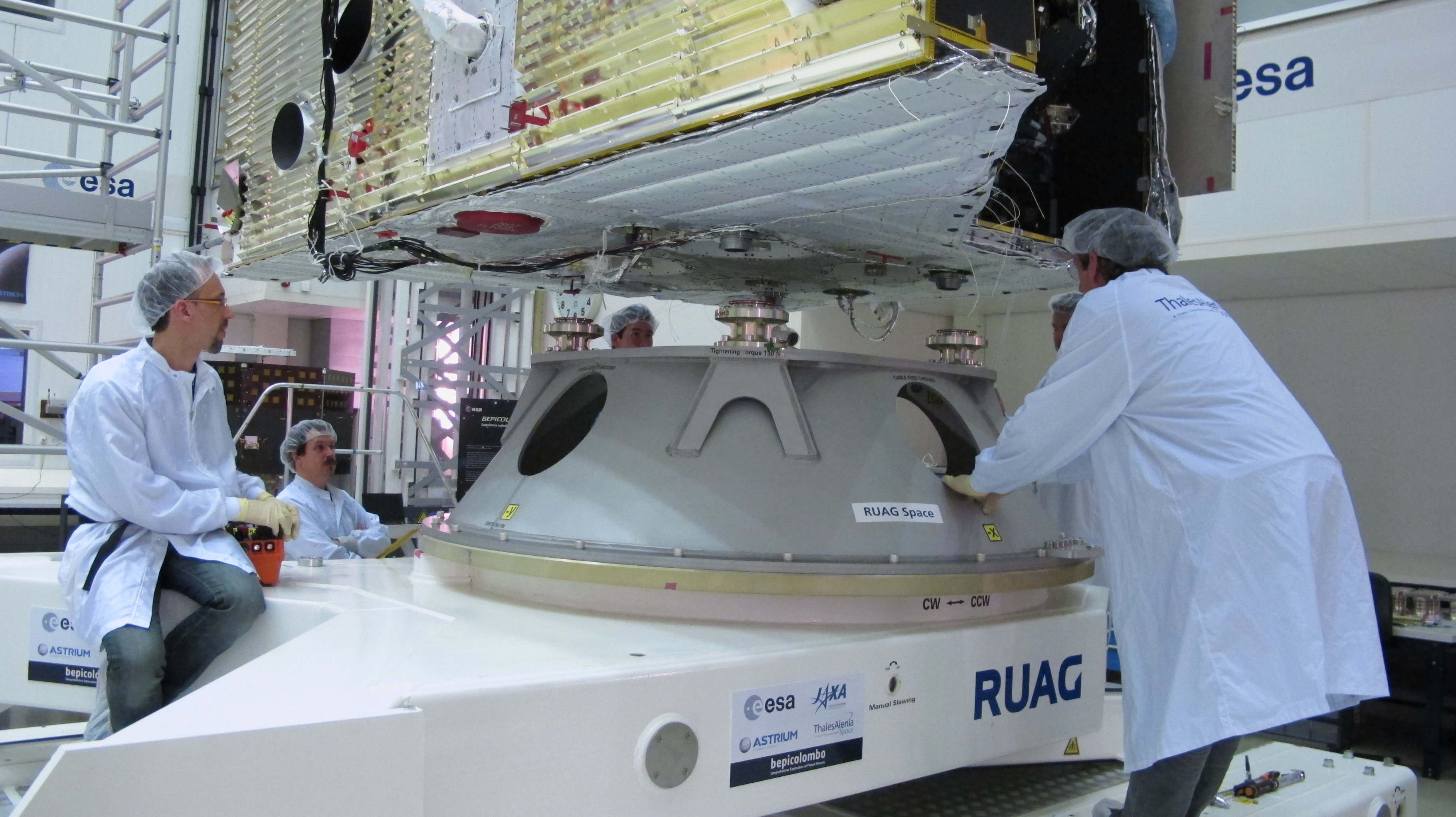 Depicts: Replacing the Mercury Planetary Orbiter in its trolley