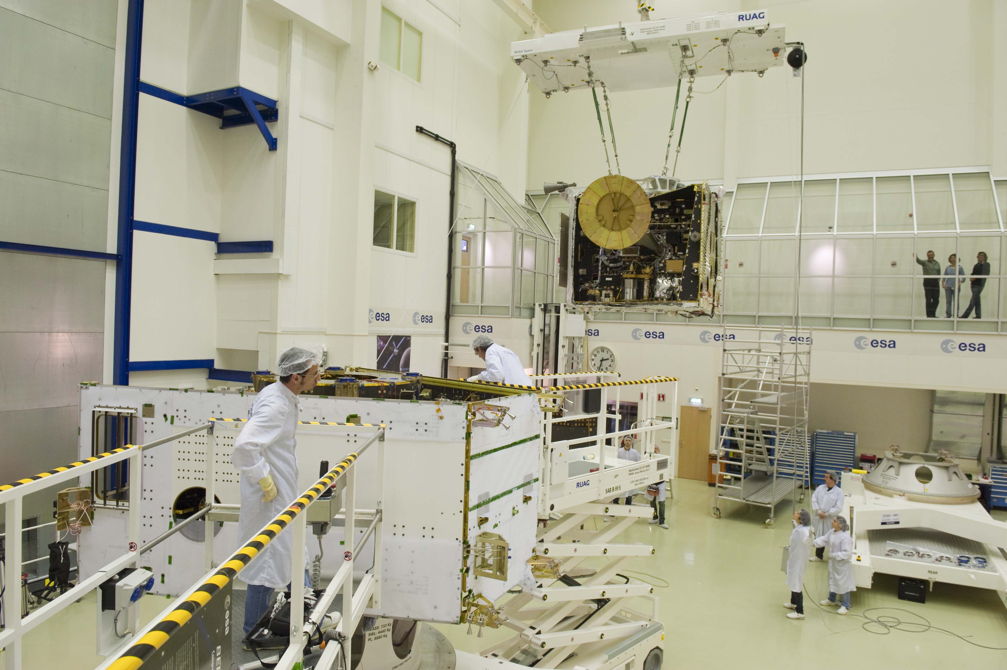 The BepiColombo Mercury Planetary Orbiter (MPO) Structural and Thermal Model (STM) being transferred from its ground handling trolley (lower right of the image) to the Mercury Transfer Module (MTM; in the foreground) by an overhead crane.