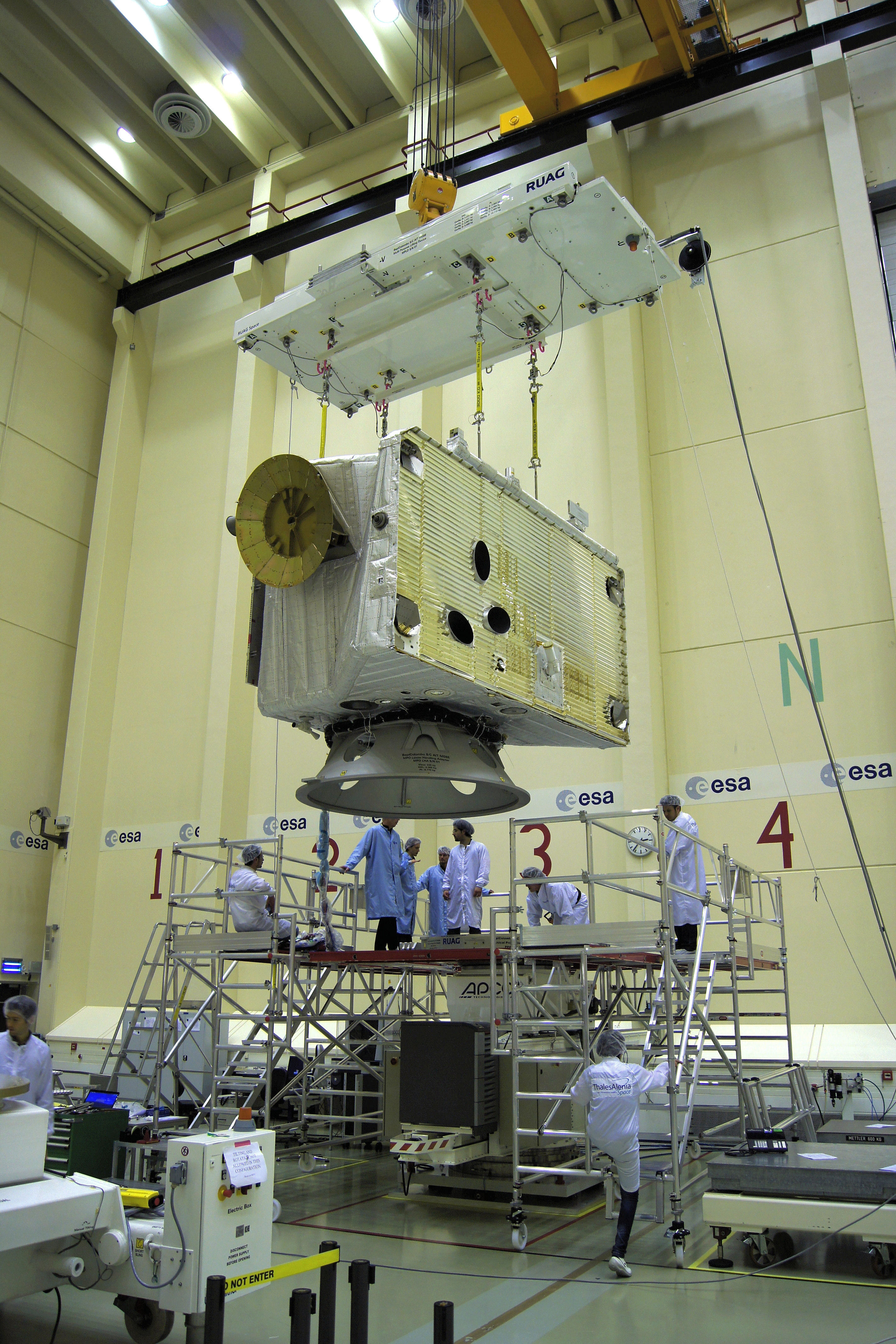 Depicts: Mercury Planetary Orbiter being lowered onto the M80/MPMA test system