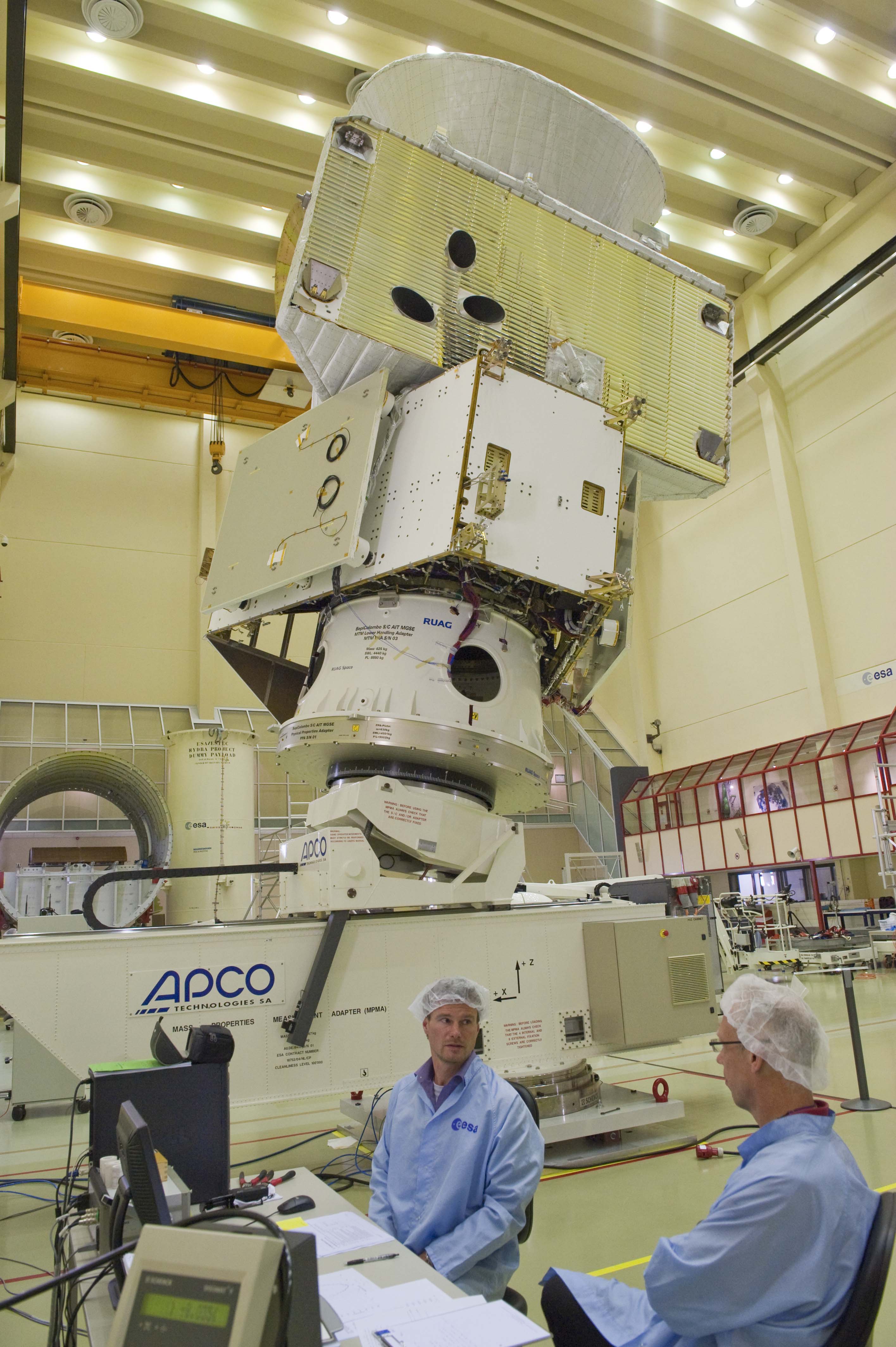 This is the first time that the composite spacecraft structural and thermal model has been fully integrated, producing the configuration in which it will be launched and effect the transfer to Mercury. It is made up of the Structural and Thermal Models (STM) of the Mercury Transfer Module (MTM) and Mercury Planetary Orbiter (MPO), the Structural Model (StM) of the Mercury Magnetospheric Orbiter (MMO) and the Proto-Flight Model of the Magnetospheric Orbiter Sunshield and Interface Structure (MOSIF).