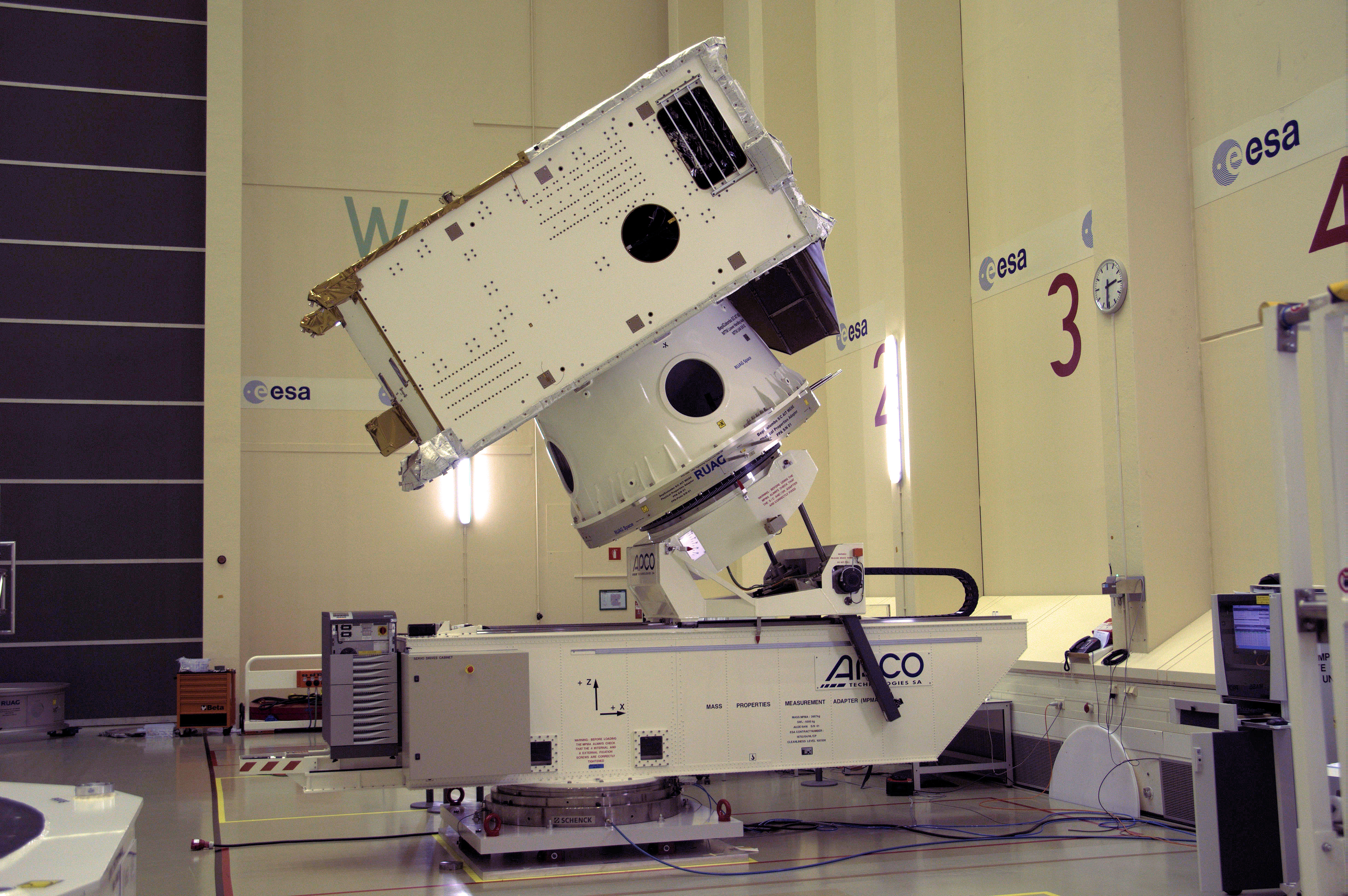 BepiColombo Mercury Transfer Module (MTM) on the M80 test system, which is fitted with its Mass Properties Measurement Adapter (MPMA). The M80/MPMA is located adjacent to the WM50/6 used for the preceding tests, in the 'Hydra' cleanroom at ESA's European Space Research and Technology Centre (ESTEC) in Noordwijk, the Netherlands.