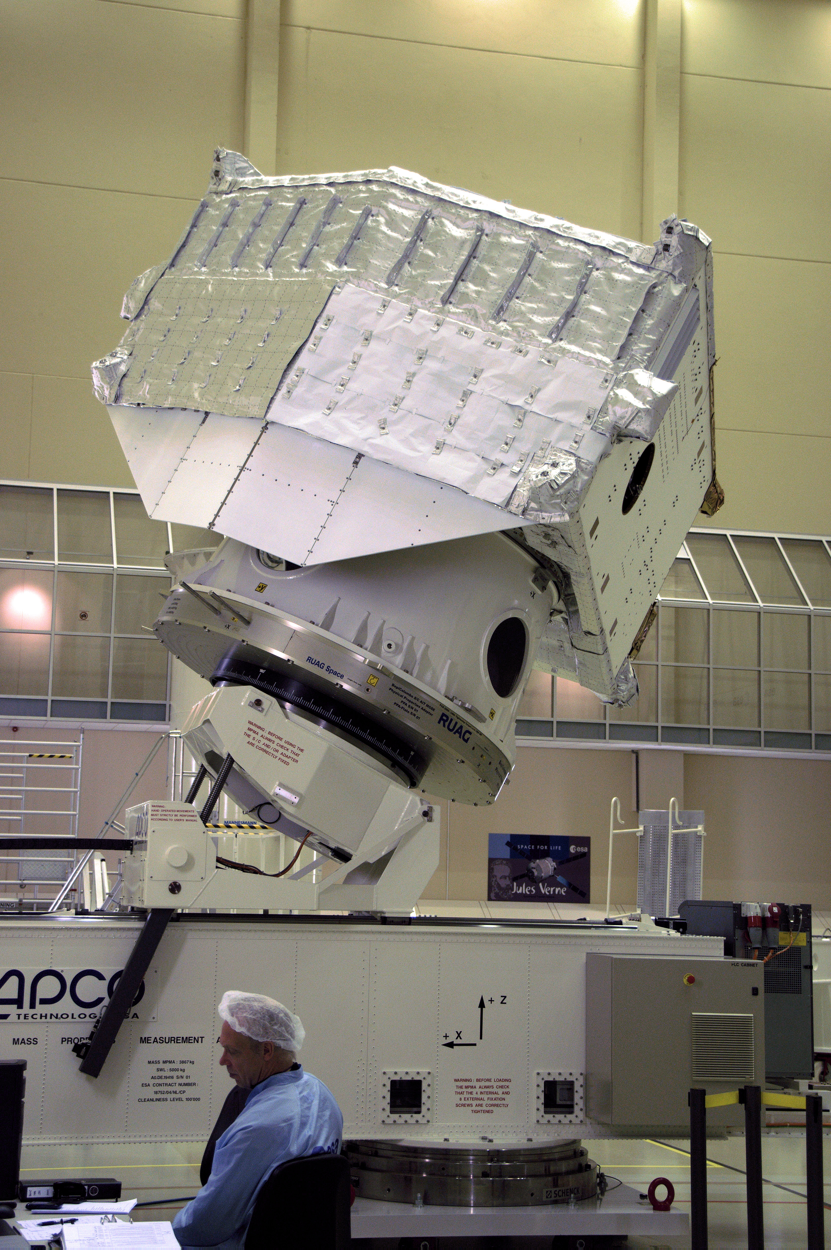 BepiColombo Mercury Transfer Module (MTM) on the M80 test system, which is fitted with its Mass Properties Measurement Adapter (MPMA). The M80/MPMA is located adjacent to the WM50/6 used for the preceding tests, in the 'Hydra' cleanroom at ESA's European Space Research and Technology Centre (ESTEC) in Noordwijk, the Netherlands.
