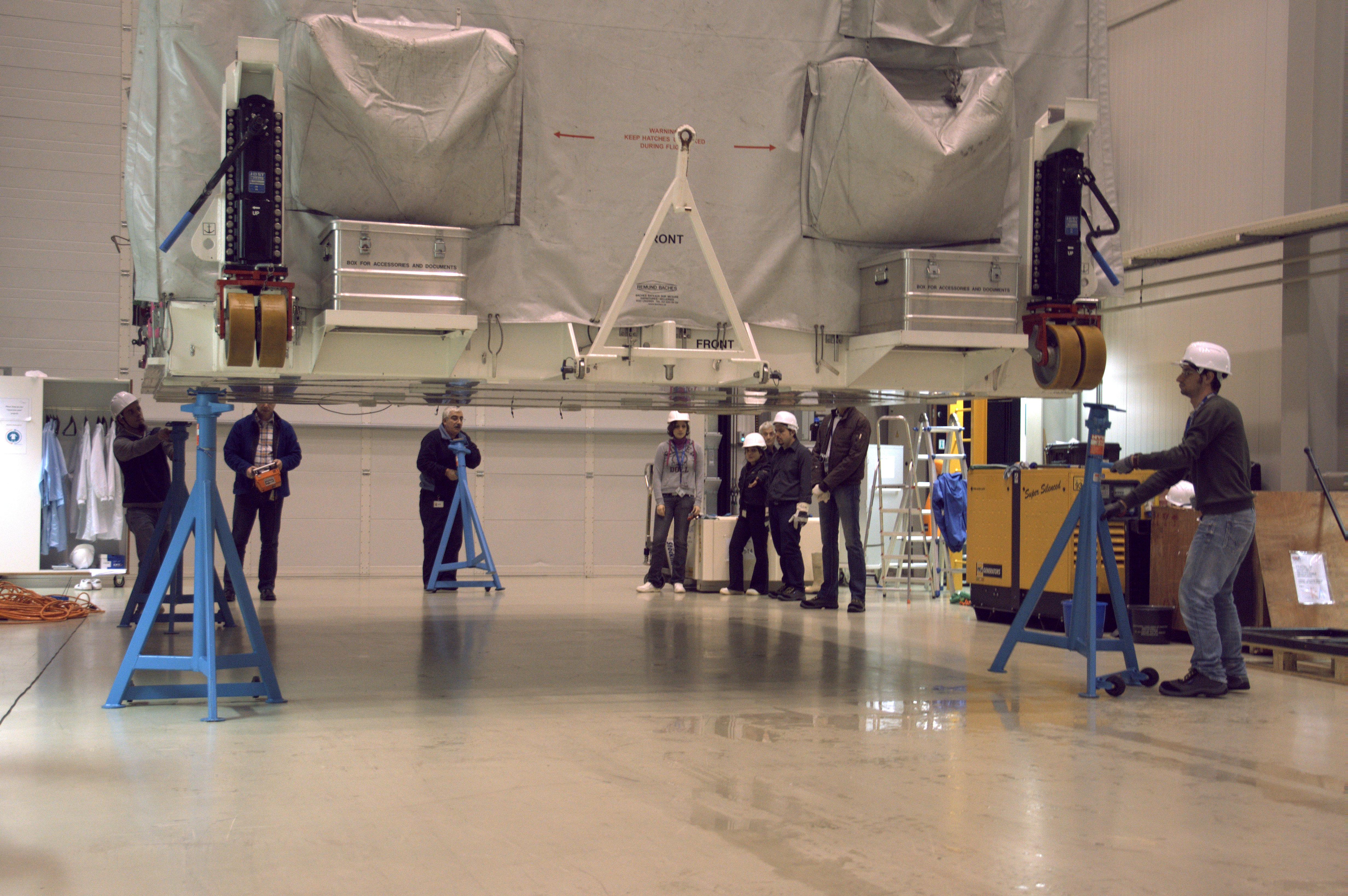The BepiColombo Mercury Planetary Orbiter (MPO) Proto-Flight Model (PFM) structure hardware arriving at ESA's European Space Research and Technology Centre (ESTEC) in Noordwijk, the Netherlands, in December 2012. It has just travelled from the Stevenage (UK) facility of Astrium, where the chemical propulsion subsystem and the network of surface heat pipes were integrated and tested. Thales Alenia Space will perform further integration of the spacecraft under the direction of the Prime Contractor, Astrium GmbH. The orbiter is packed in a specially built transport container that provided it with protection against vibration and shocks. The container has been cleaned while supported by a crane. It is about to be lowered onto the floor.