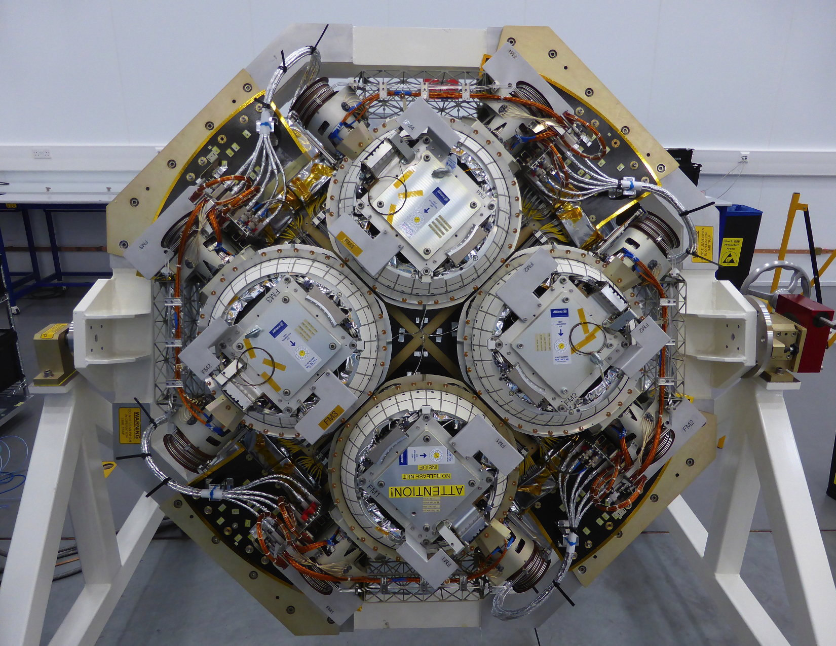 The BepiColombo Mercury Transfer Module (MTM) ProtoFlight Model (PFM) thruster floor upon delivery to Thales Alenia Space in Turin for testing. The two-axis pointing systems for the four thrusters are installed; the thrusters themselves will be integrated while the MTM is at ESTEC, along with the rest of the flight model hardware for the electrical propulsion system.