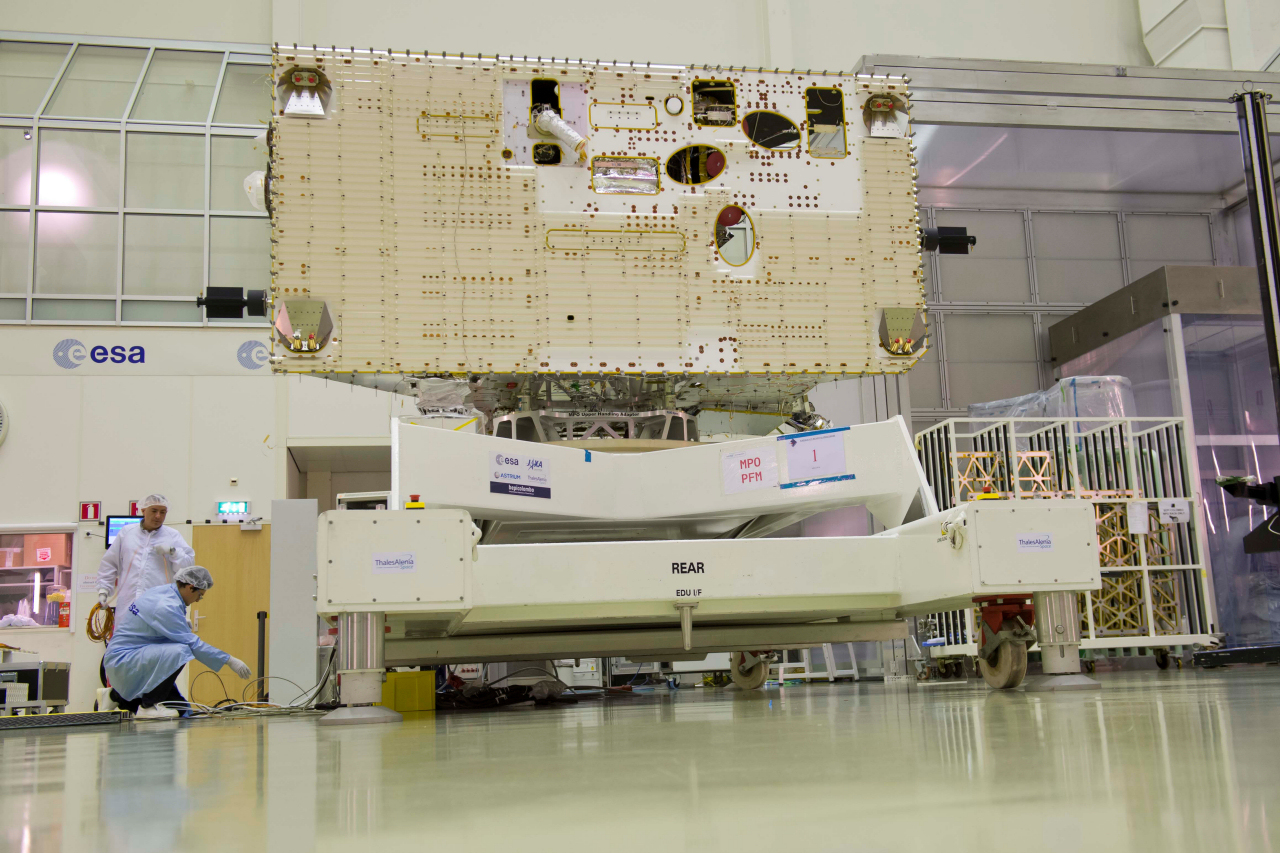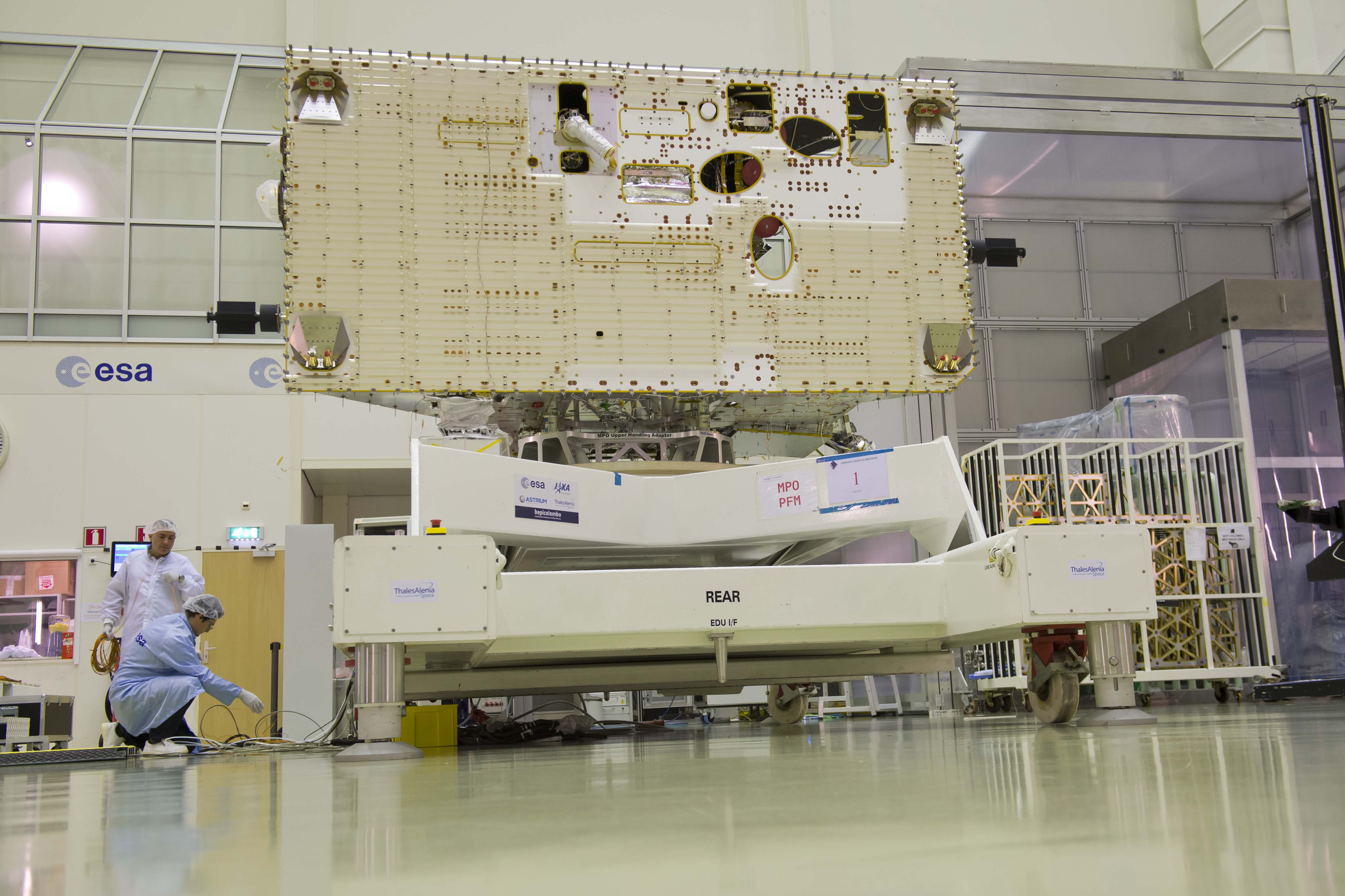 The proto-flight model of the BepiColombo Mercury Planetary Orbiter (MPO) in the test centre at ESA's European Space Research and Technology Centre (ESTEC) in Noordwijk, the Netherlands.