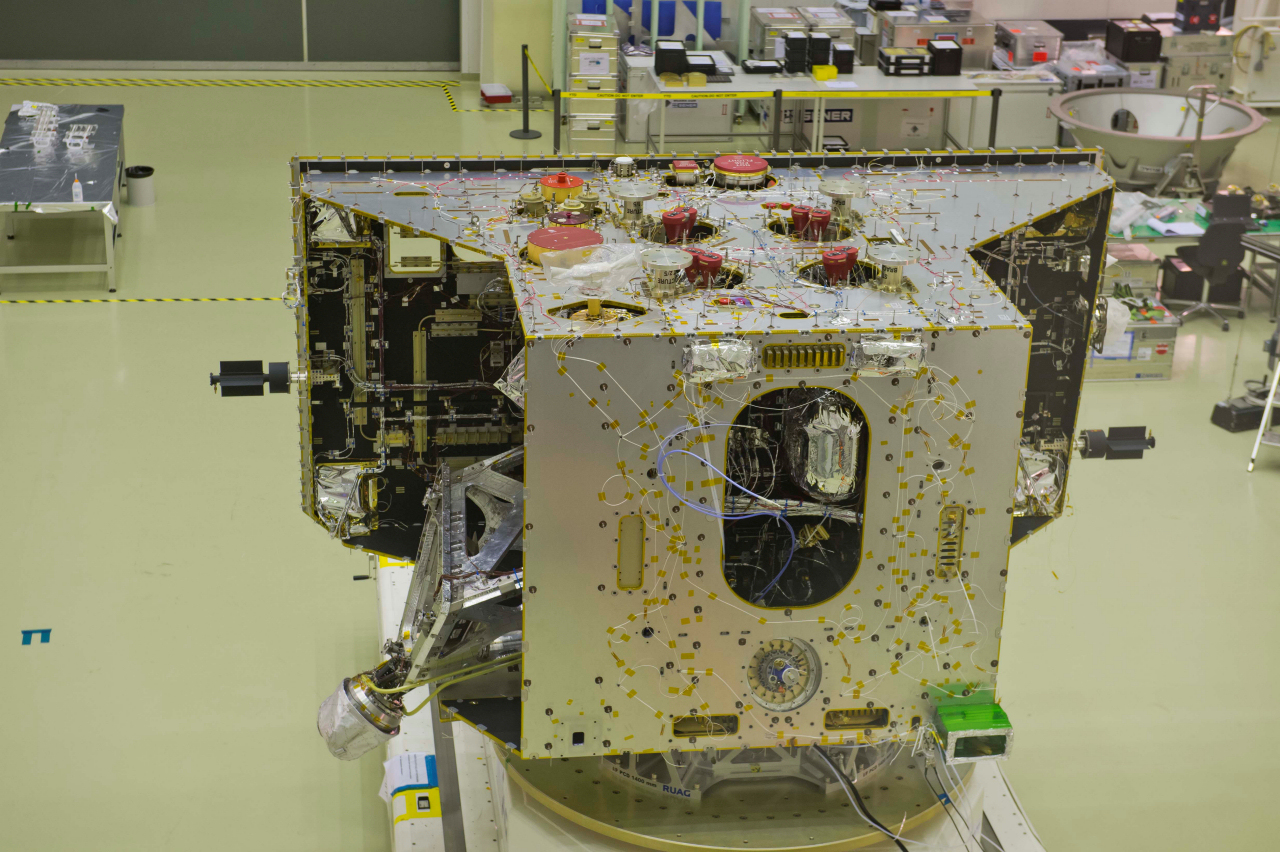 The proto-flight model of the BepiColombo Mercury Planetary Orbiter (MPO) in a cleanroom in the test centre at ESA's European Space Research and Technology Centre (ESTEC) in Noordwijk, the Netherlands.