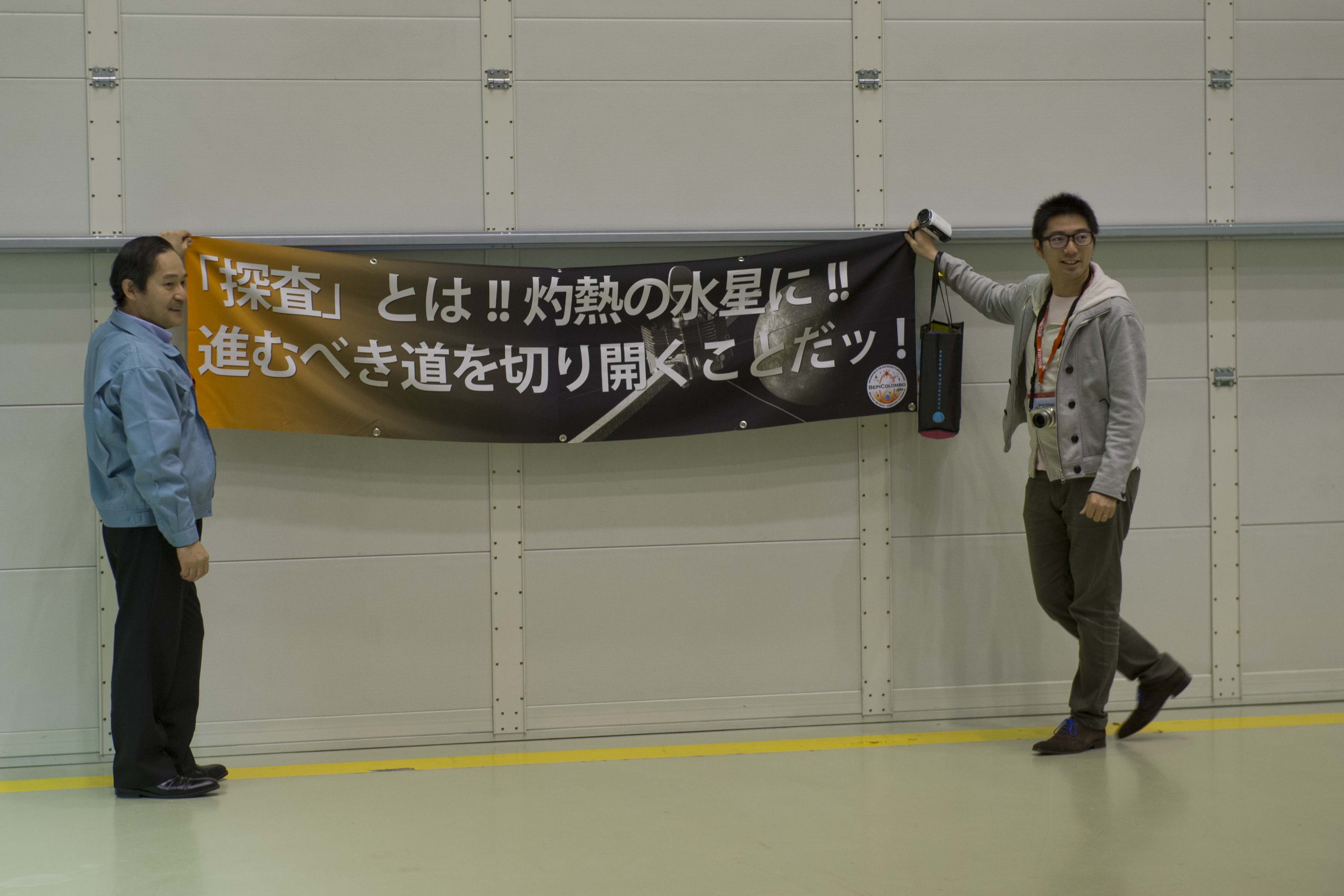 BepiColombo engineers – members of the BepiColombo Mercury Magnetospheric Orbiter (MMO) assembly, integration and test (AIT) and payload teams – who have travelled to ESA's European Space Research and Technology Centre (ESTEC) to support the testing and integration of the MMO, hold up a banner that translates as 'The ultimate exploration is pioneering a new path on the scorching planet, Mercury!' The quote is derived from a popular comic series in Japan.