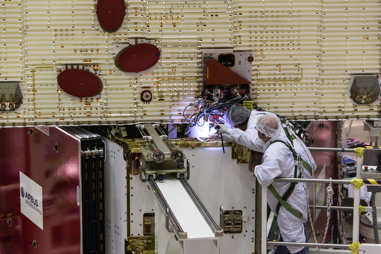 Work being carried out on the BepiColombo flight model stack in ESA's test centre in May 2017.