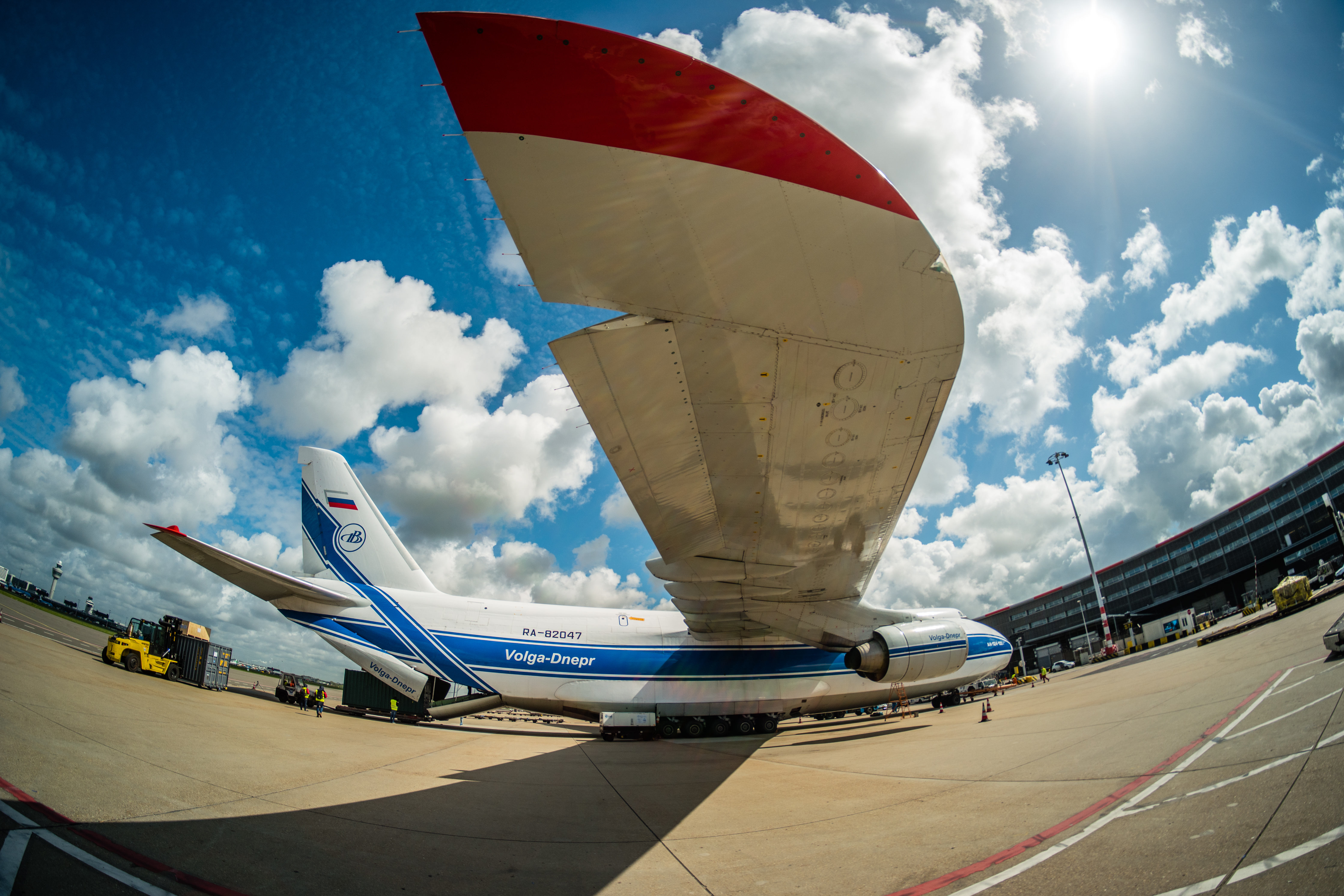 Under the wing of the Antonov cargo plane that carried ESA's Mercury Planetary Orbiter from Amsterdam Schiphol airport in the Netherlands, to Kourou, French Guiana.