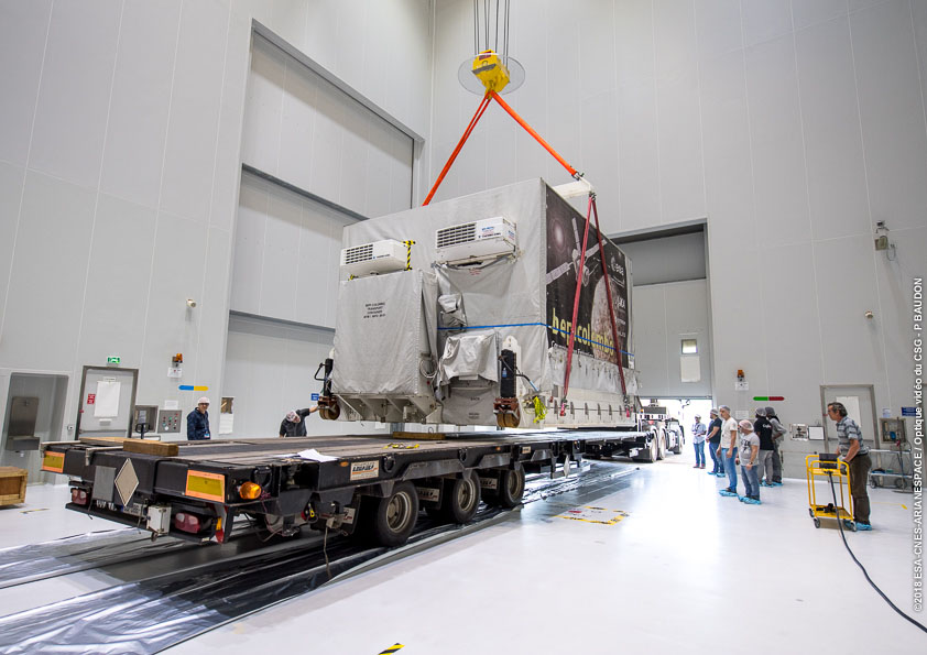 The shipping container with ESA's Mercury Planetary Orbiter (MPO) of the ESA–JAXA BepiColombo mission arrives at Europe's Spaceport in Kourou for launch preparations.