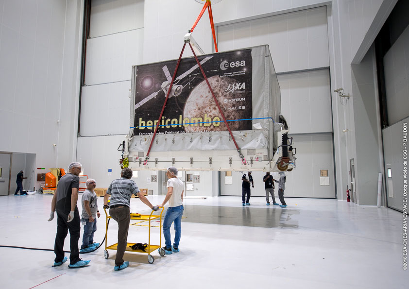 The shipping container with ESA's Mercury Planetary Orbiter (MPO) of the ESA–JAXA BepiColombo mission arrives at Europe's Spaceport in Kourou for launch preparations.
