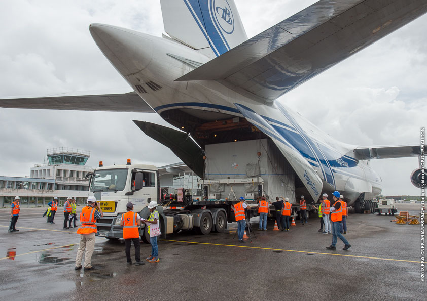 ESA's Mercury Transfer Module (MTM) of the ESA–JAXA BepiColombo mission arrives in Kourou, French Guiana for launch preparations at Europe's Spaceport.