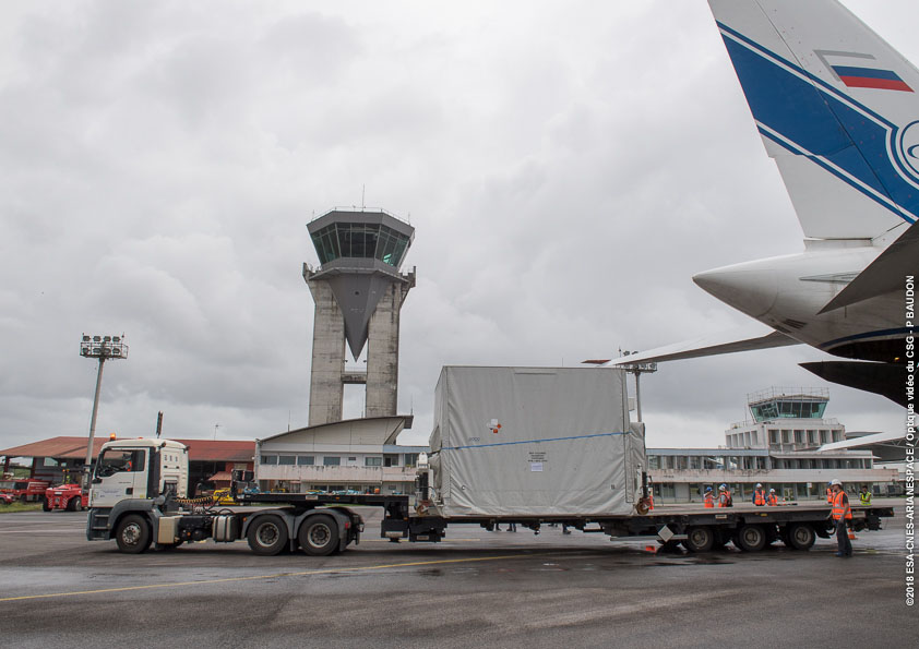 ESA's Mercury Transfer Module (MTM) of the ESA–JAXA BepiColombo mission arrives in Kourou, French Guiana for launch preparations at Europe's Spaceport.