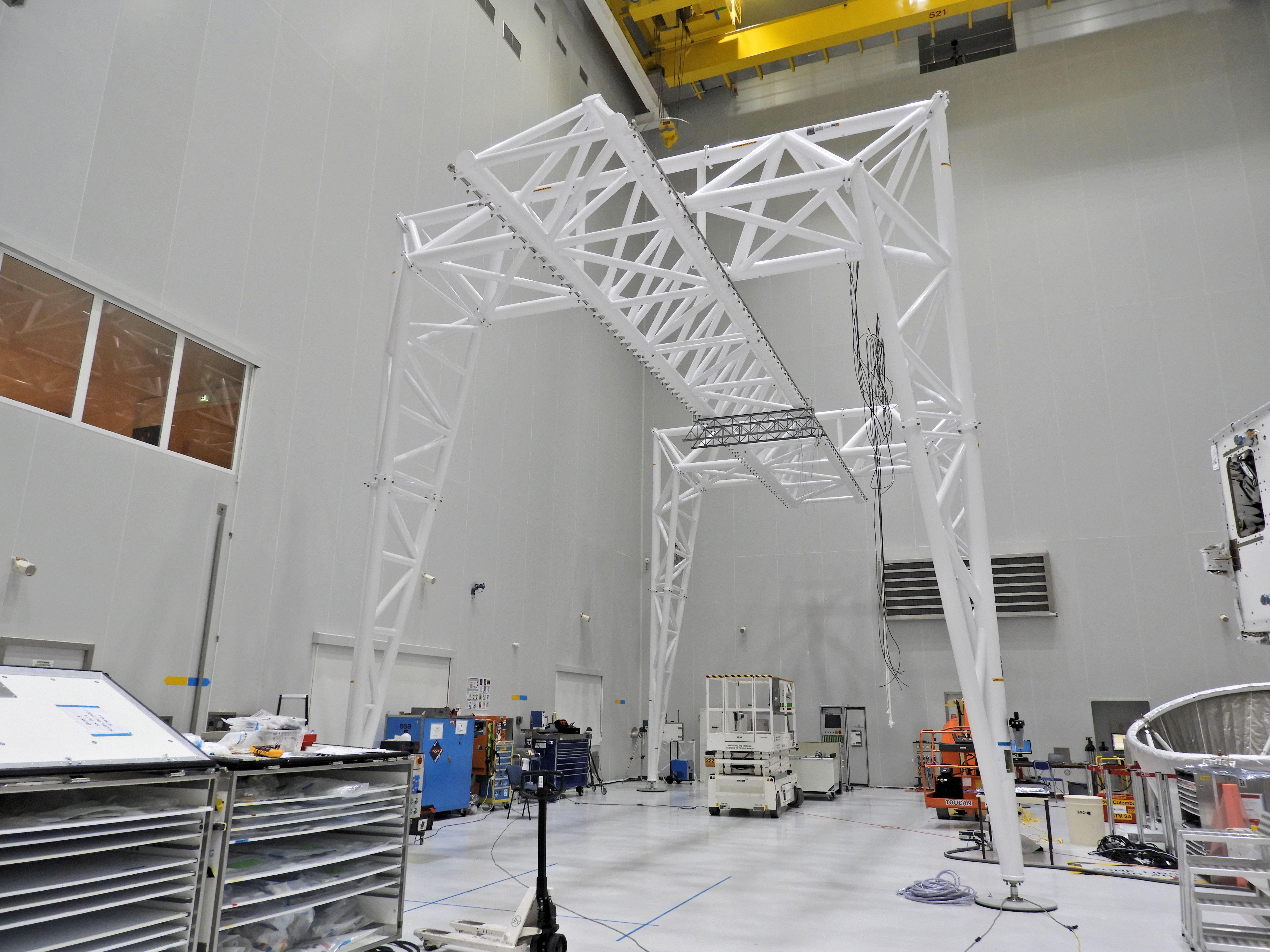 Setting up the rig needed for the solar array deployment tests for the BepiColombo Mercury Transfer Module and Mercury Planetary Orbiter. The equipment is needed to support the solar arrays from above, to simulate the weightlessness of space. The transfer module's two solar wings reach about 14 m either side of the spacecraft body, while the orbiter's single three-panel array is 7.5 m long.