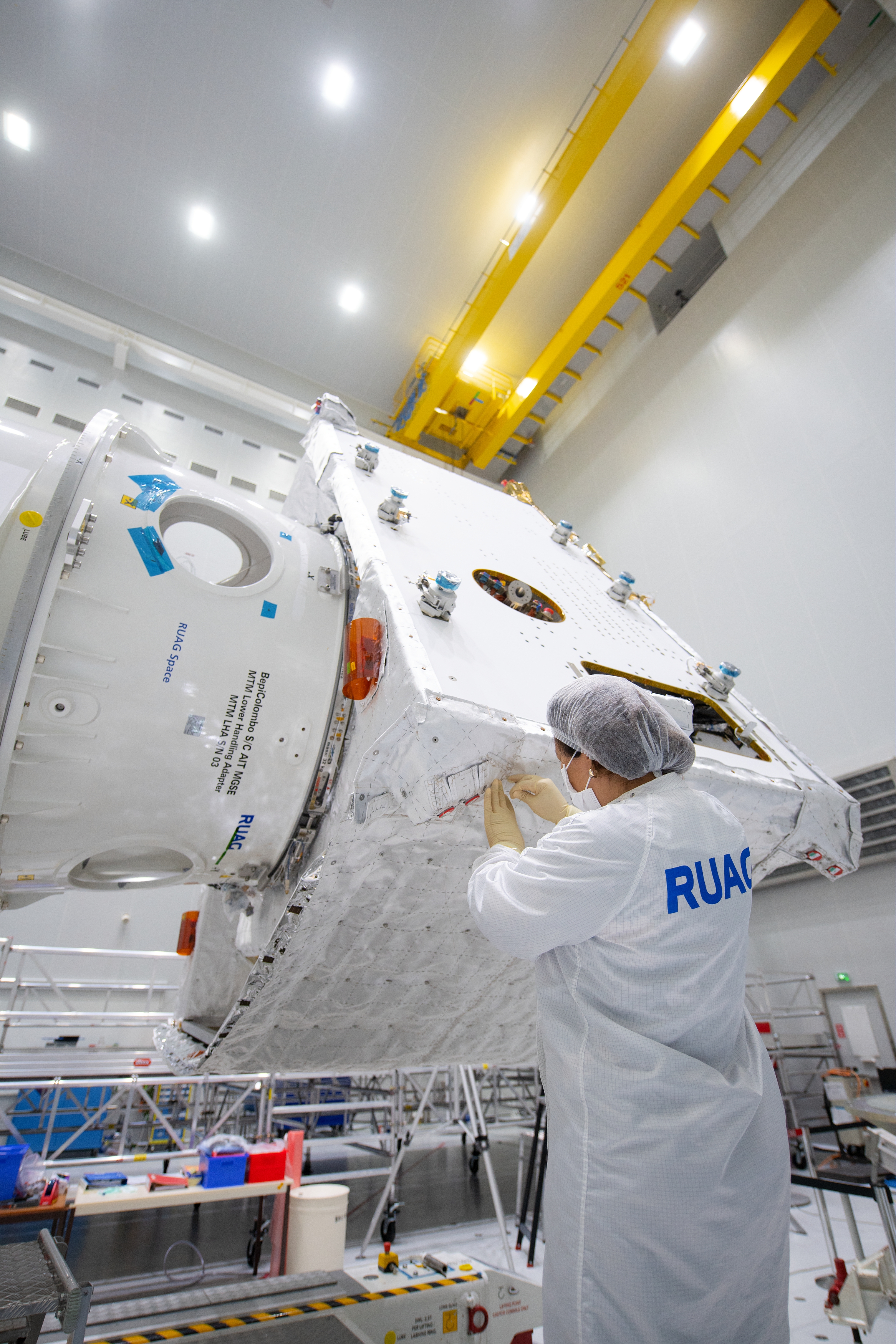 The ESA-JAXA BepiColombo mission at Europe's Spaceport undergoing intense preparations for launch. Here, sewing of the insulation blankets on ESA's Mercury Transfer Module (MTM) is taking place. The insulation is to protect the spacecraft from the extreme thermal conditions that will be experienced during the mission.