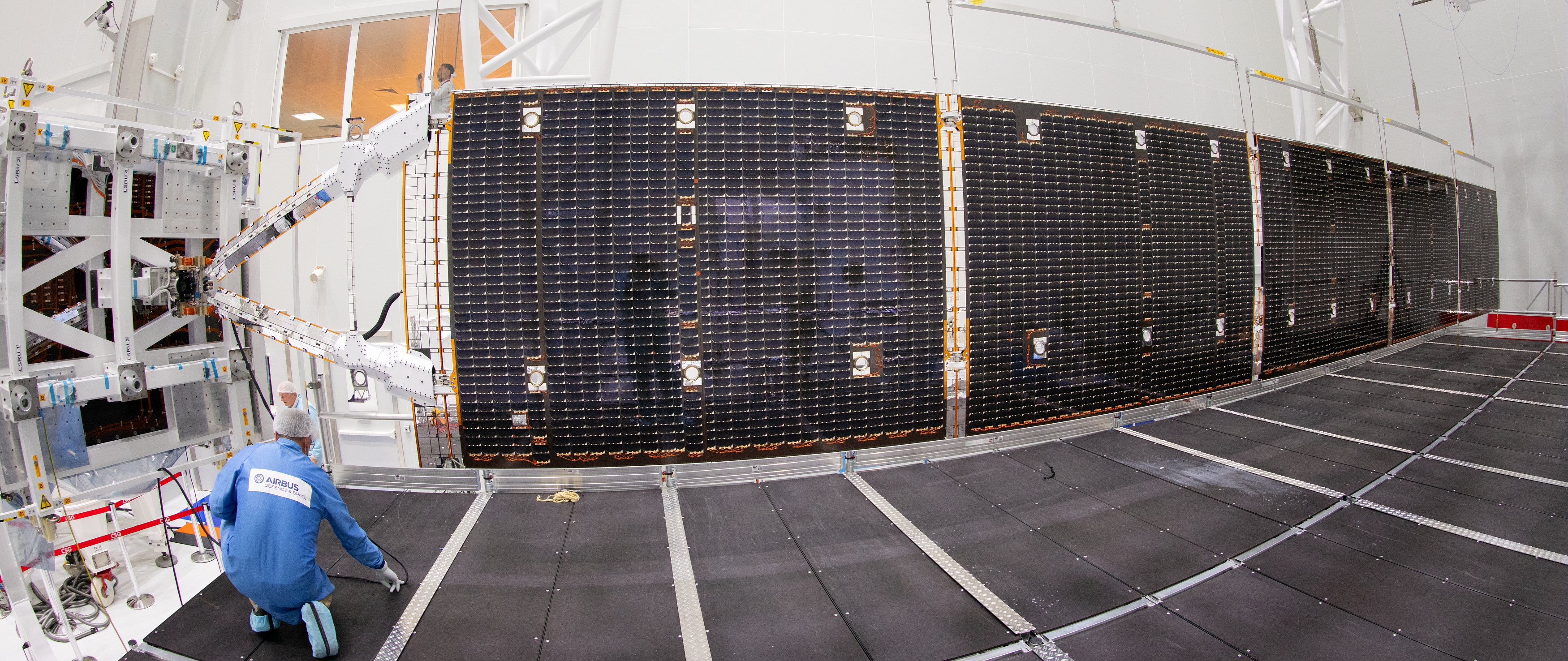 One of the solar panel wings of the BepiColombo Mercury Transfer Module (MTM) during launch preparations at Europe's Spaceport.