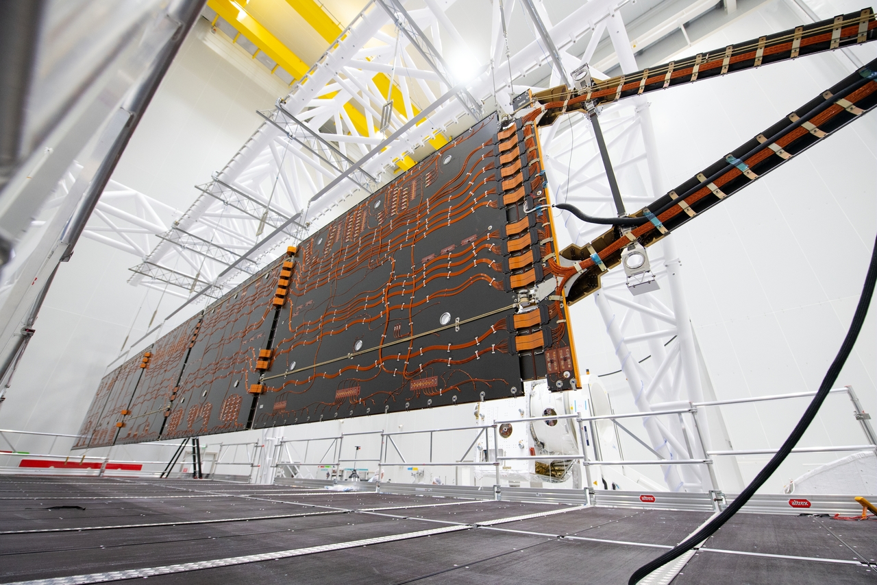 One of the solar panel wings of the BepiColombo Mercury Transfer Module (MTM) during launch preparations at Europe's Spaceport.