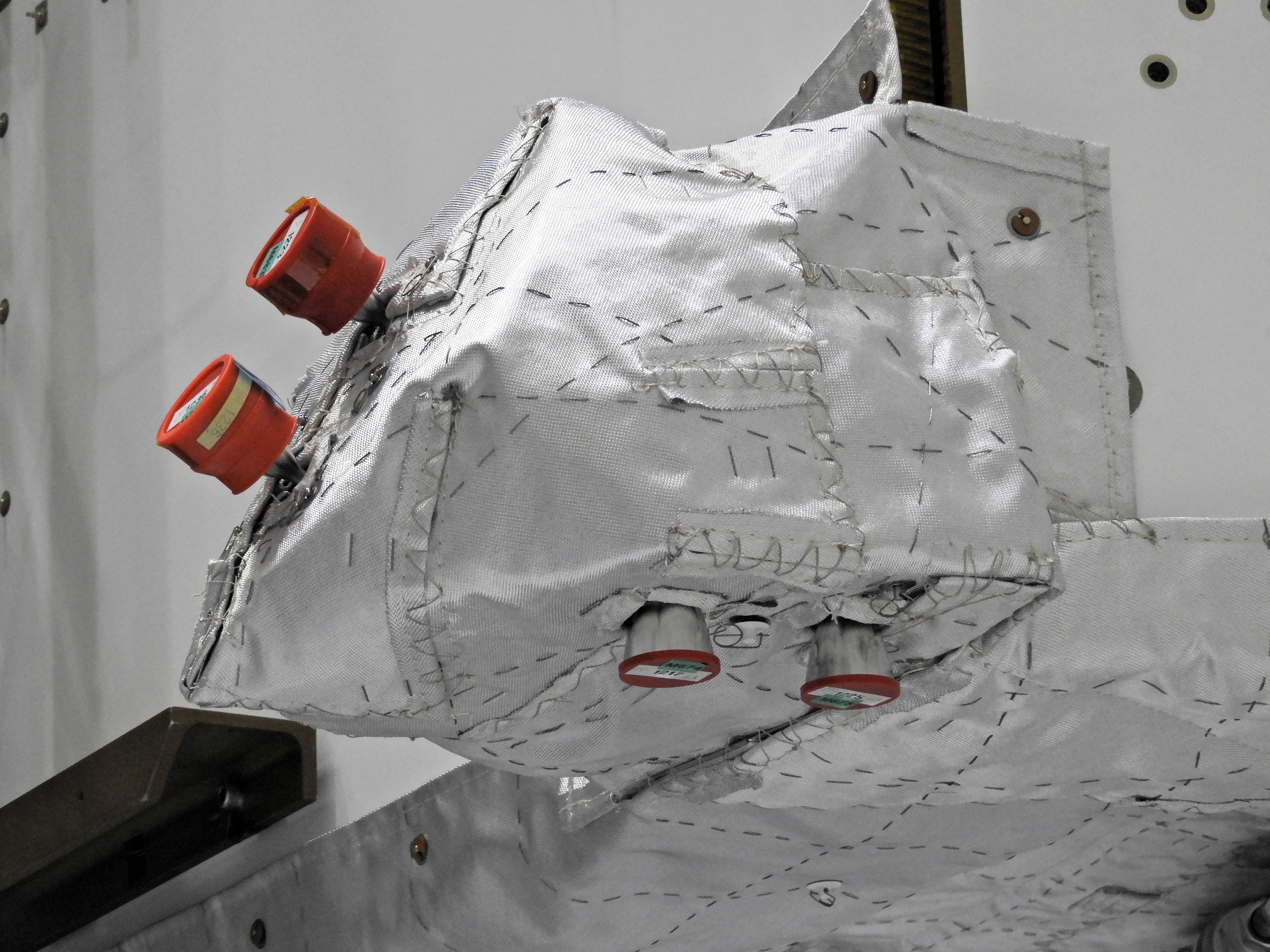 Chemical propulsion thrusters of the BepiColombo Mercury Transfer Module (MTM), which will be used to perform attitude and orbital control manoeuvres during the seven planetary flybys at Earth, Venus and Mercury that will take the spacecraft to Mercury orbit. The red, labelled covers will be removed before launch.