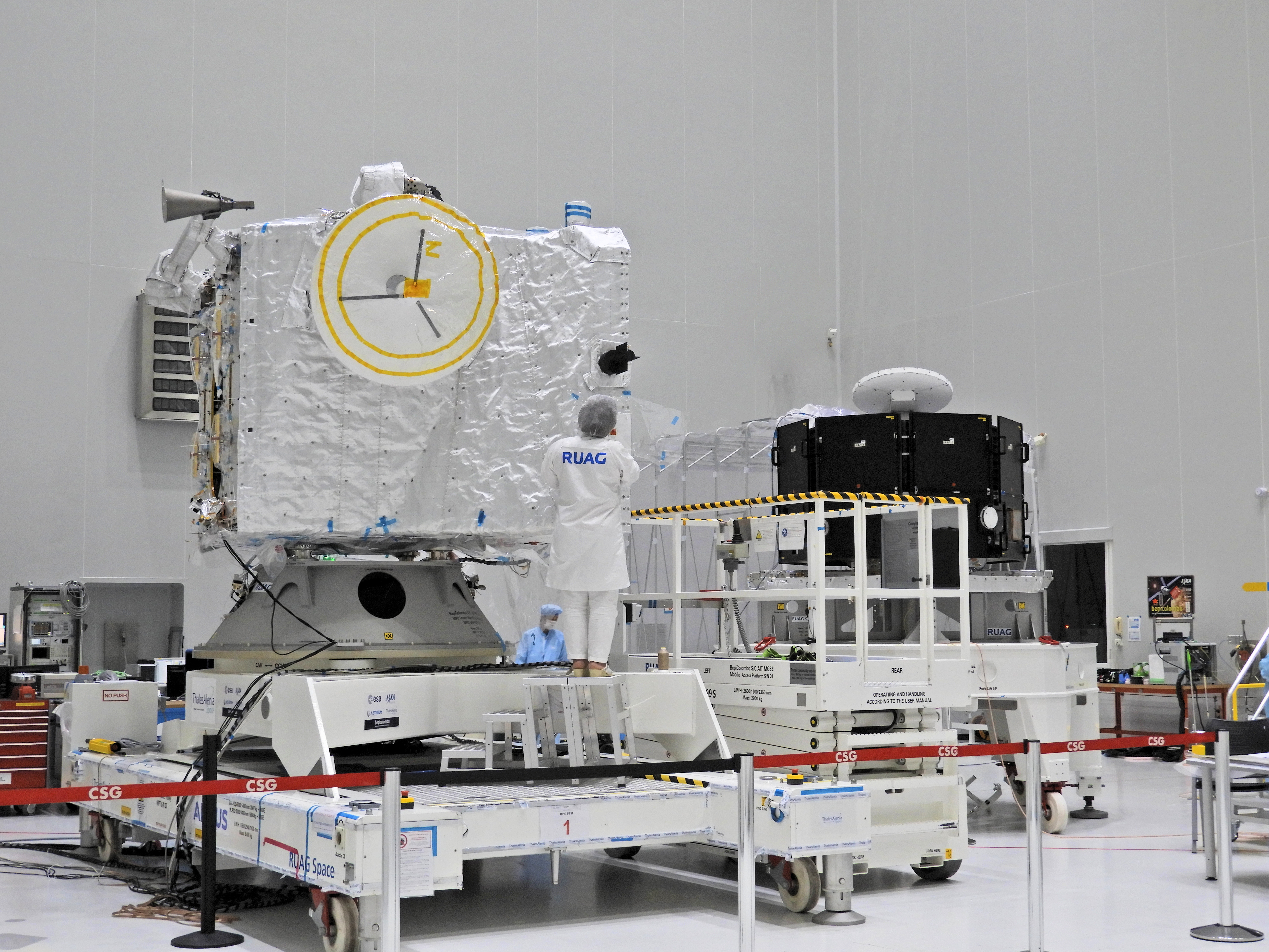 The ESA-JAXA BepiColombo mission at Europe's Spaceport undergoing intense preparations for launch. Here, sewing of the insulation blankets on ESA's Mercury Planetary Orbiter (MPO) is taking place, while JAXA's Mercury Magnetospheric Orbiter (MMO) can be seen in the background.