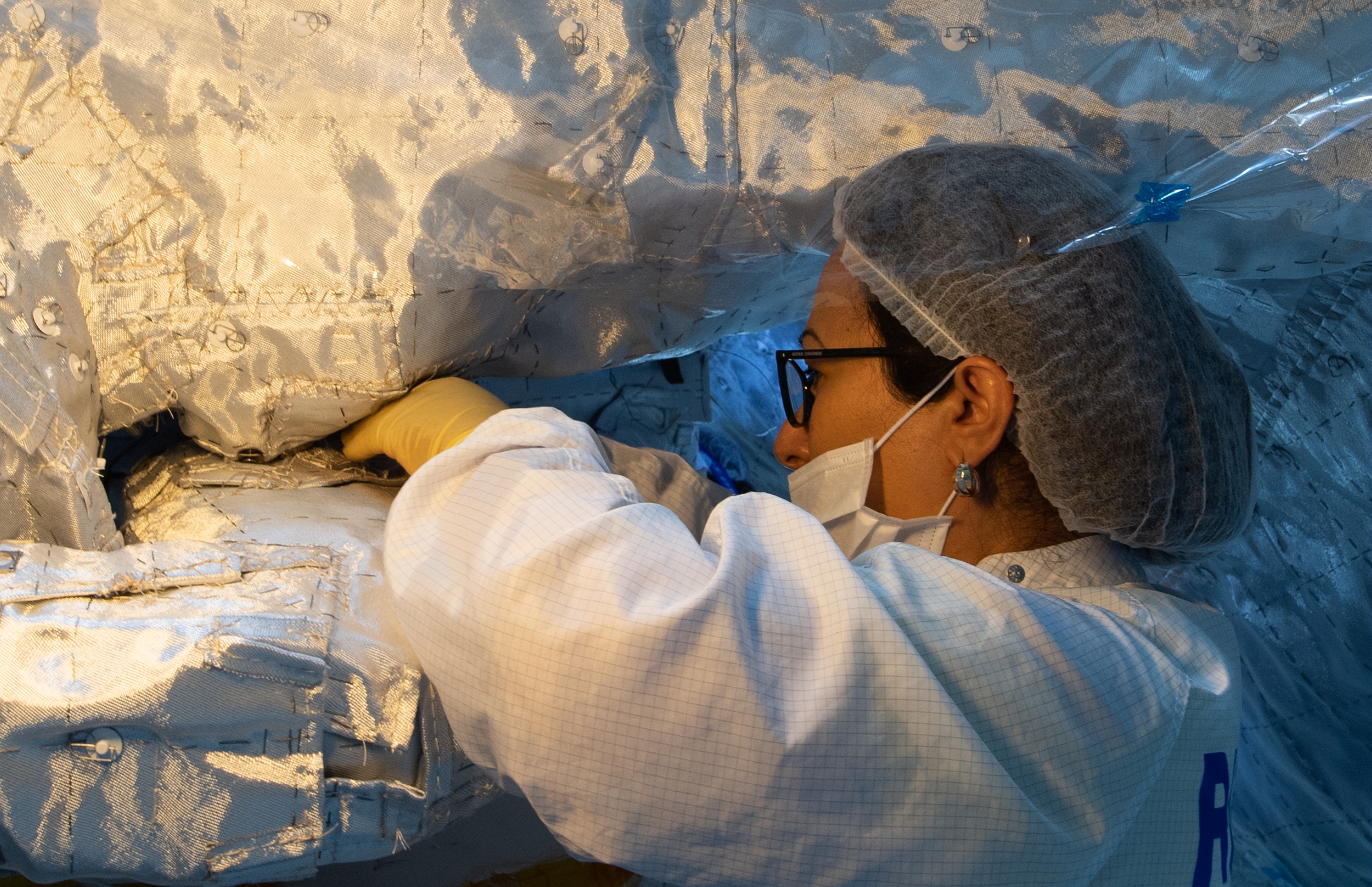 Finishing touches to the sewing of the multi-layered insulation around the Mercury Planetary Orbiter, or MPO, high-gain antenna and mechanisms, seen in stowed configuration. The insulation is to protect the spacecraft from the extreme thermal conditions that will be experienced during the mission.