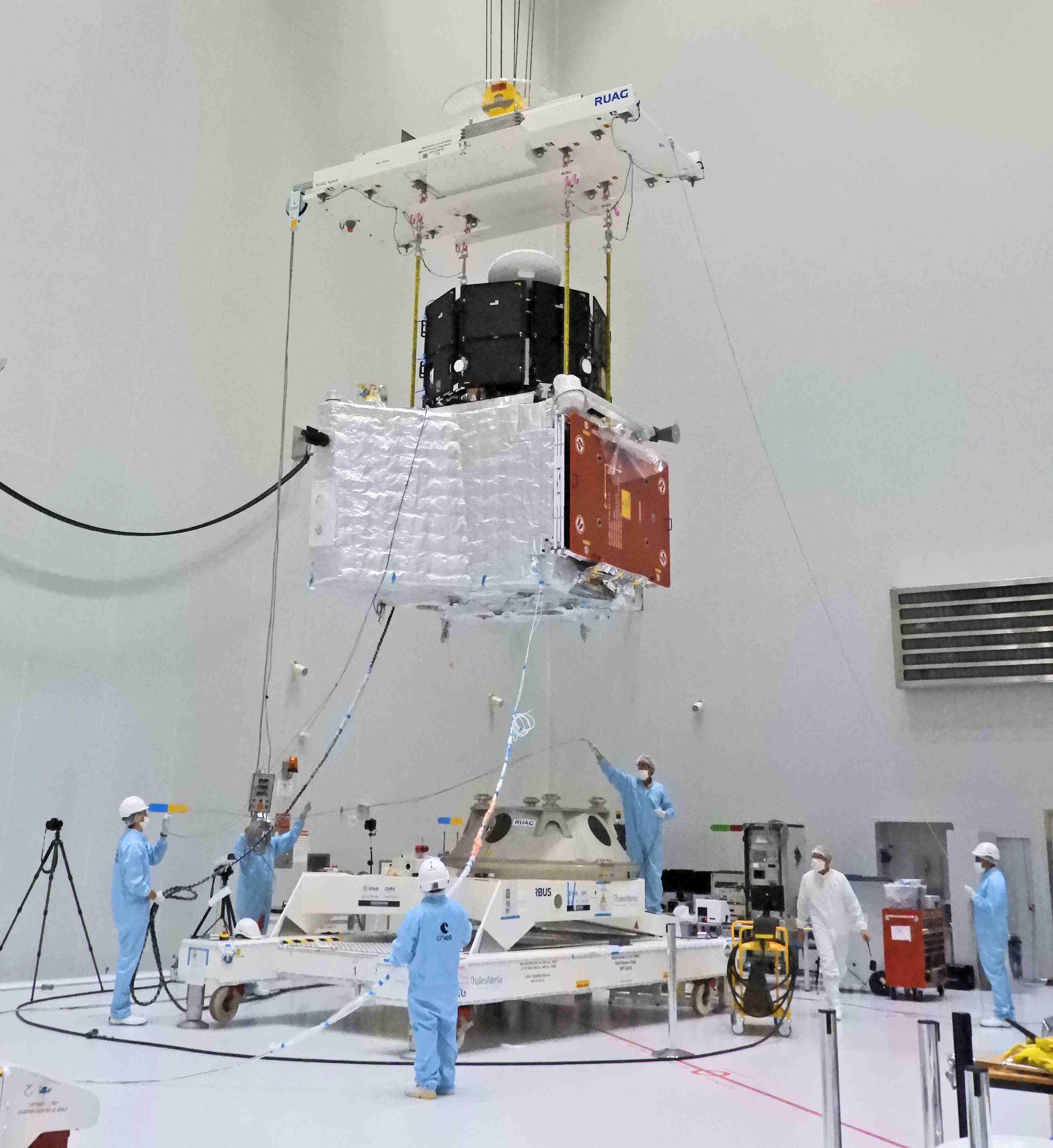 ESA's Mercury Planetary Orbiter (MPO, bottom) and JAXA's Mercury Magnetospheric Orbiter (MMO, top) arranged in their launch configuration at Europe's Spaceport in Kourou, in preparation for a 'fit-check' with the Mercury Transfer Module (not visible in this image).