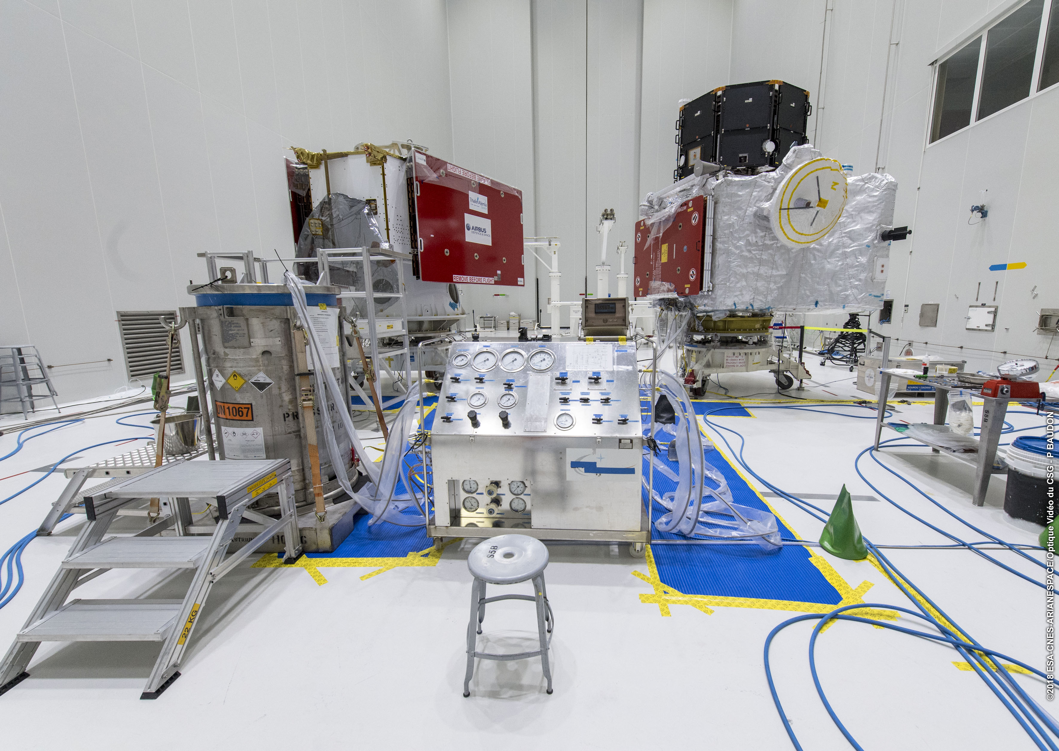 The BepiColombo Mercury Transfer Module and Mercury Planetary Orbiter being prepared for chemical propulsion fuelling.