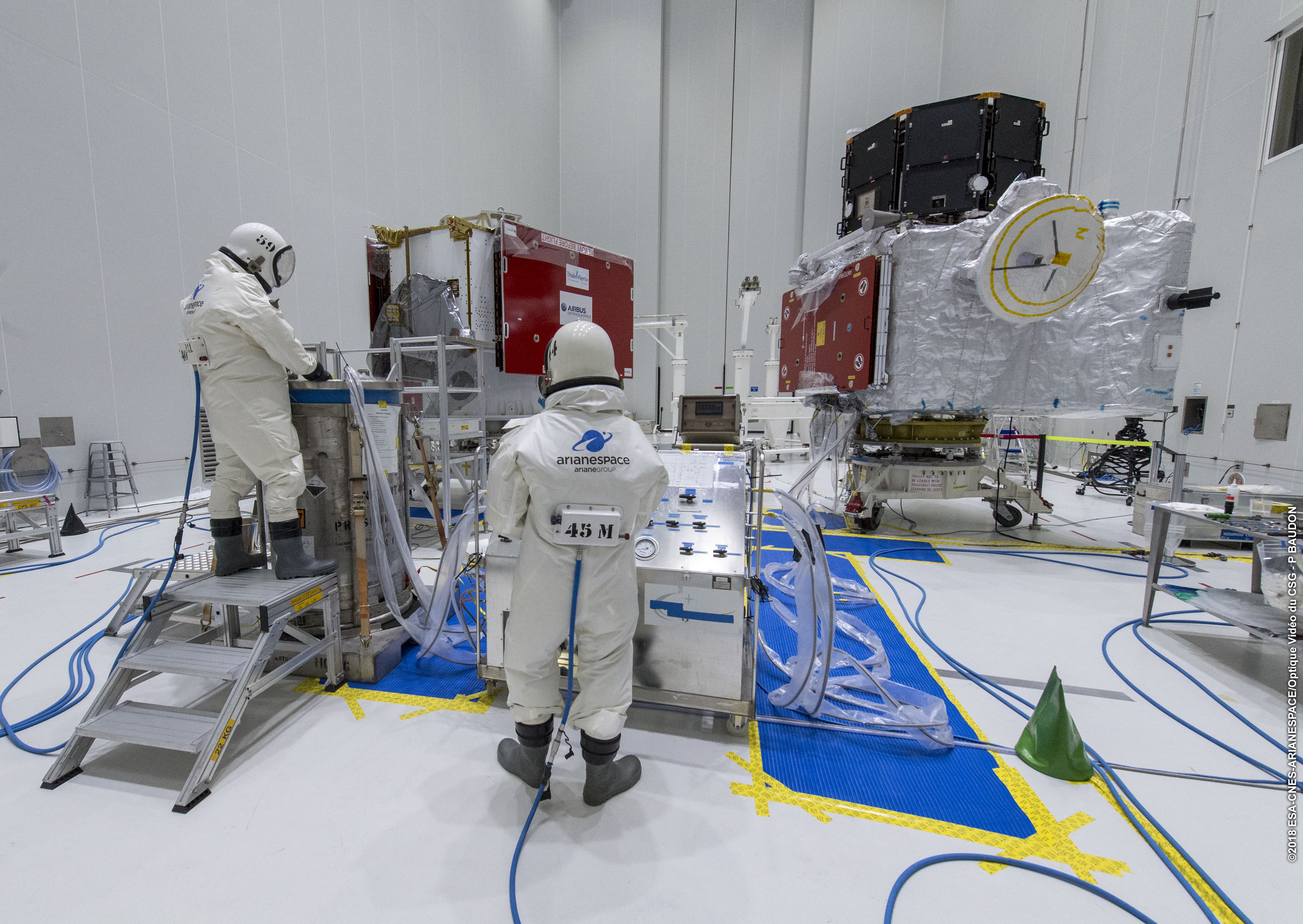 The BepiColombo Mercury Transfer Module and Mercury Planetary Orbiter being prepared for chemical propulsion fuelling.