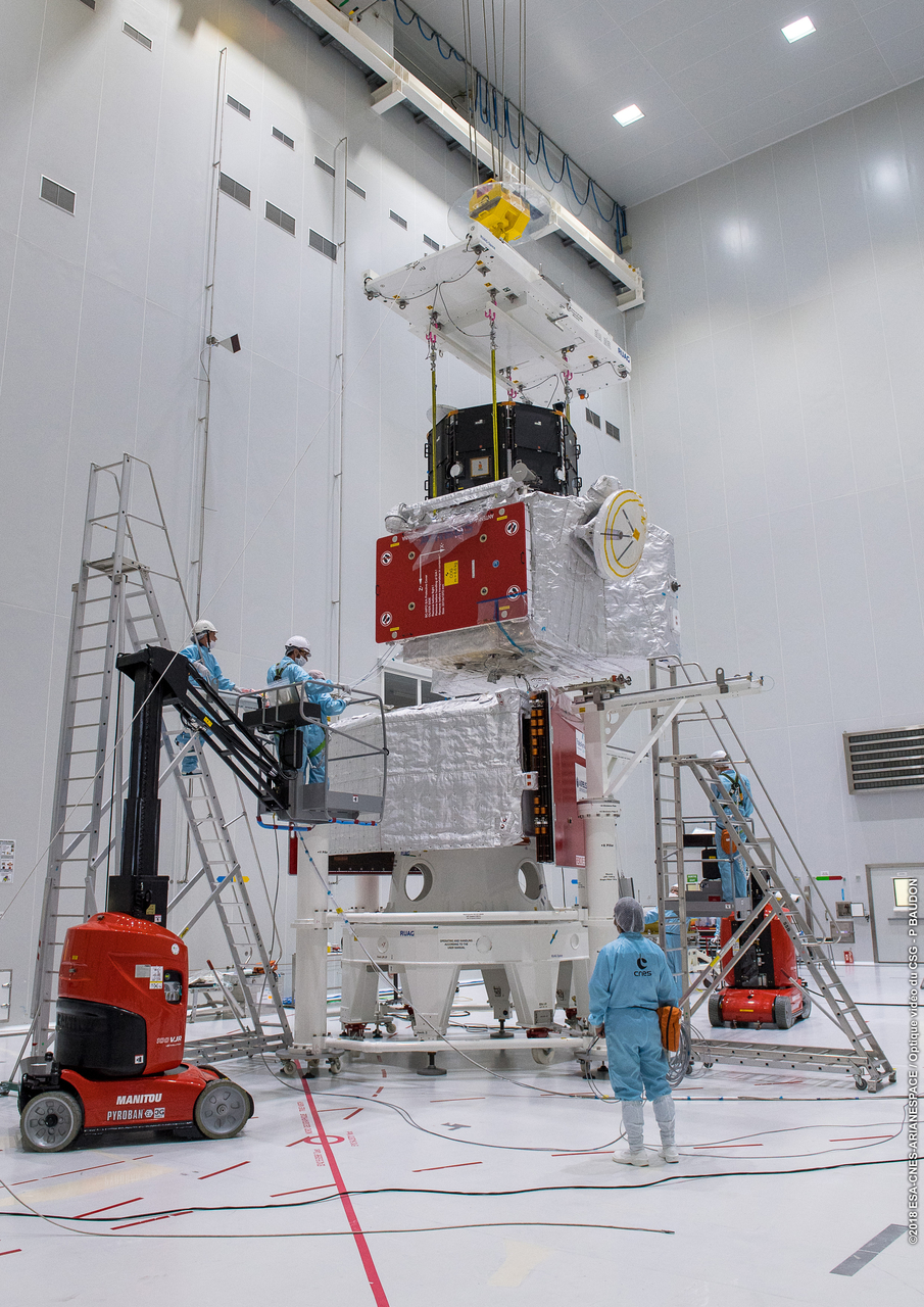 Engineers move the BepiColombo "mini-stack" comprising ESA's Mercury Planetary Orbiter and JAXA's Mercury Magnetospheric Orbiter towards the Mercury Transfer Module to complete the spacecraft stack.