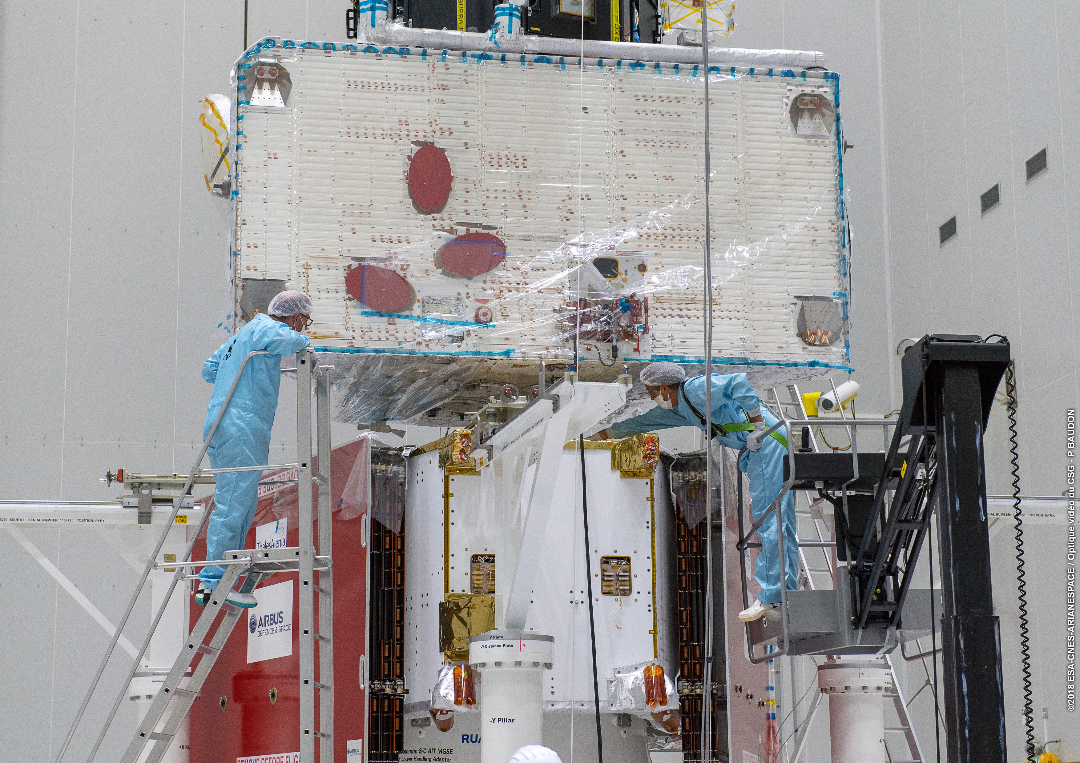Engineers lower the BepiColombo "mini-stack" comprising ESA's Mercury Planetary Orbiter and JAXA's Mercury Magnetospheric Orbiter towards the Mercury Transfer Module to complete the spacecraft stack.