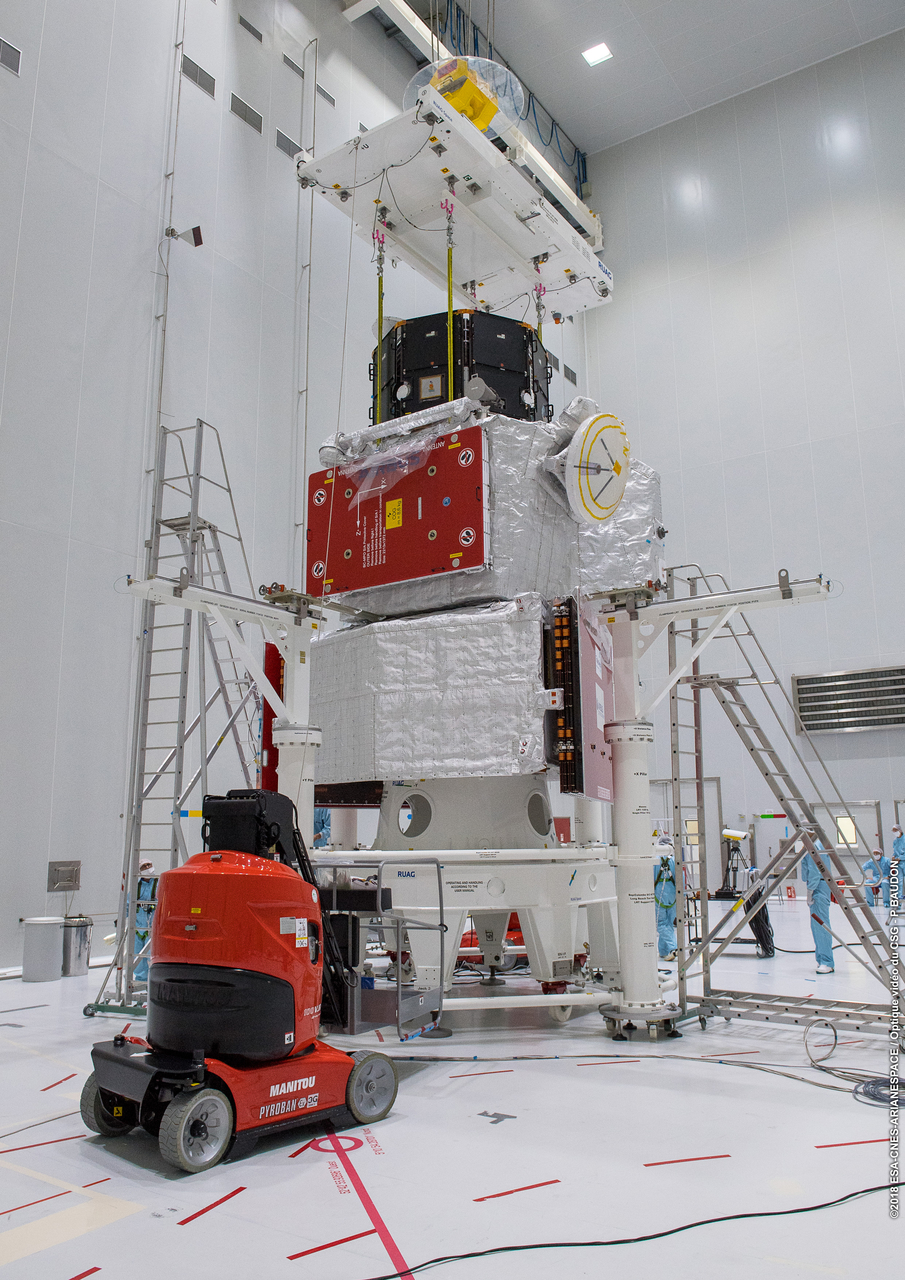 The three spacecraft of the BepiColombo mission to Mercury are stacked together in launch configuration. ESA's Mercury Transfer Module sits at the bottom, the Mercury Planetary Orbiter is in the middle, and JAXA's Mercury Magnetospheric Orbiter is on top. The sunshield that will protect the module during the cruise phase will be added about a week before launch.