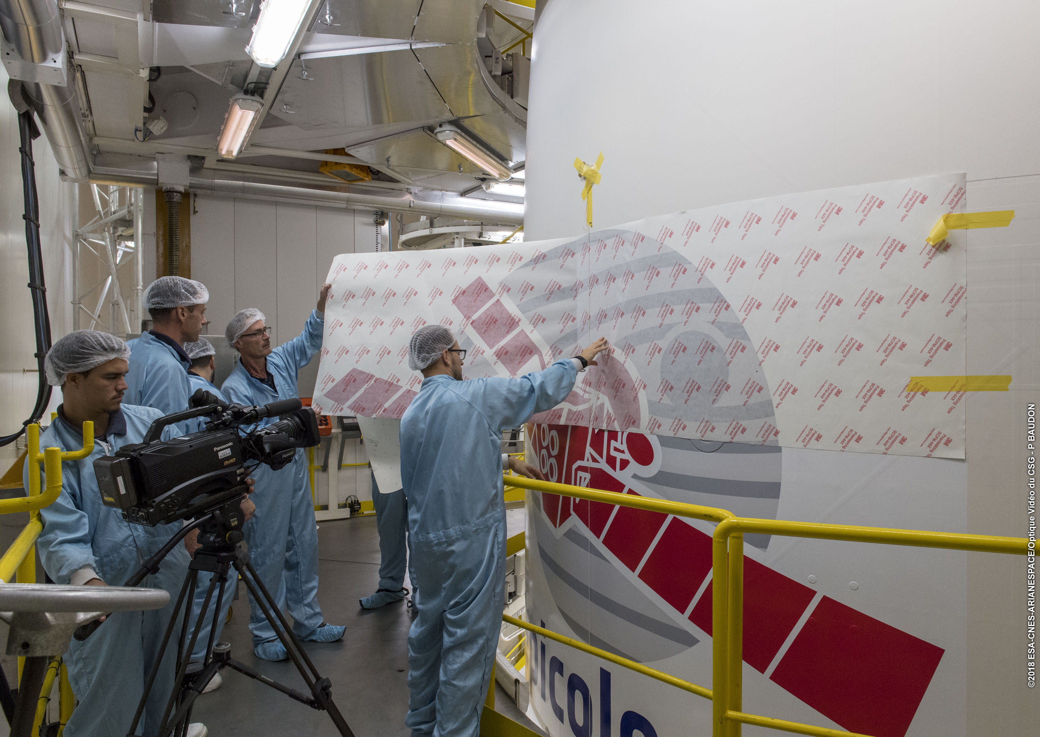 The BepiColombo mission logo sticker is added to the fairing of the Ariane 5 launcher that will lift the spacecraft into orbit.