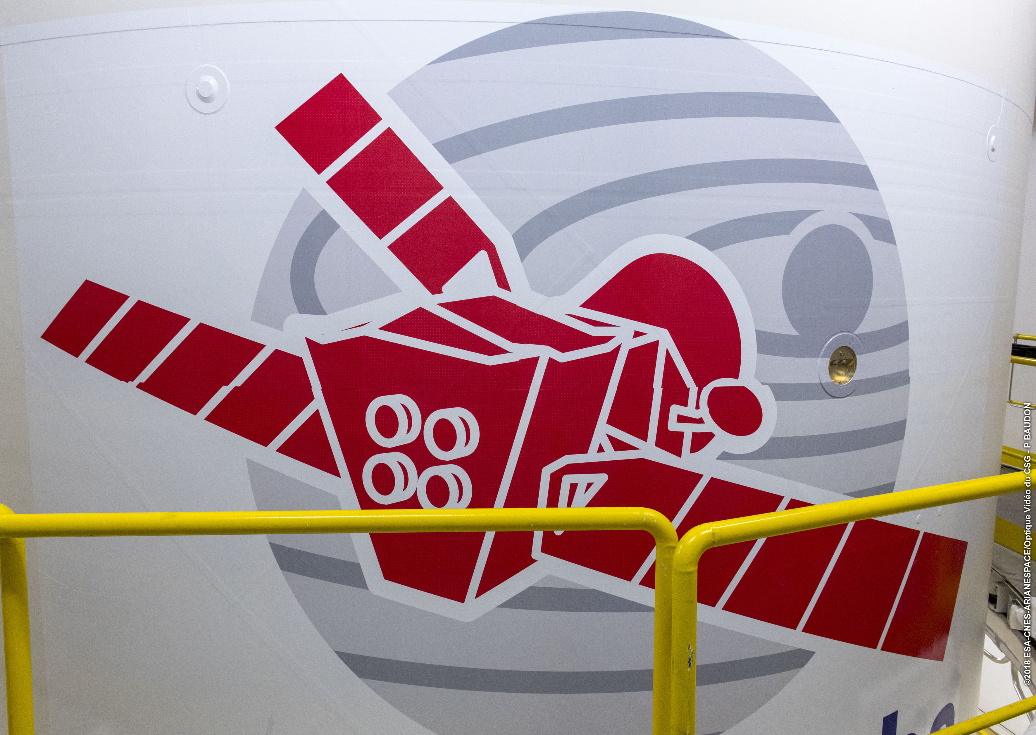 The BepiColombo mission logo sticker is added to the fairing of the Ariane 5 launcher that will lift the spacecraft into orbit.